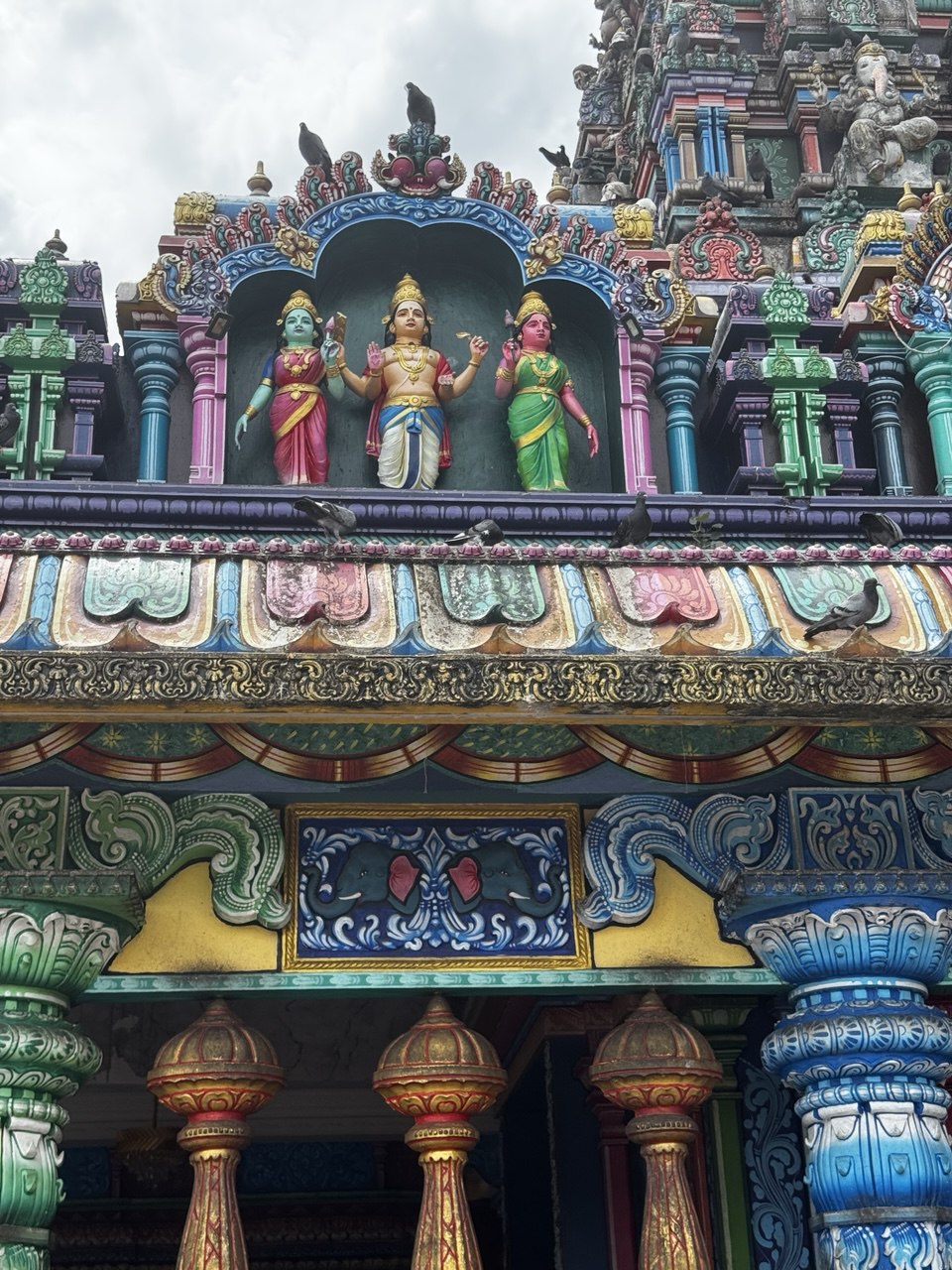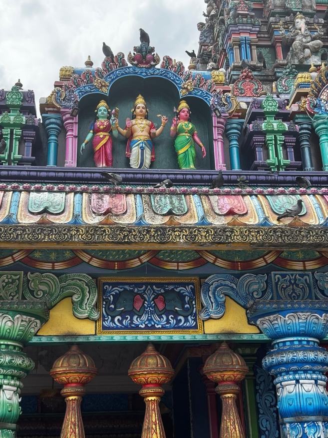 Краски здесь яркие, местами уже выгоревшие, местами обновлённые, где-то облупившиеся от дождей и жары. Голуби сидят прямо на головах у божеств, обезьяны бегают по карнизам, а внутри в это время идут обычные службы.