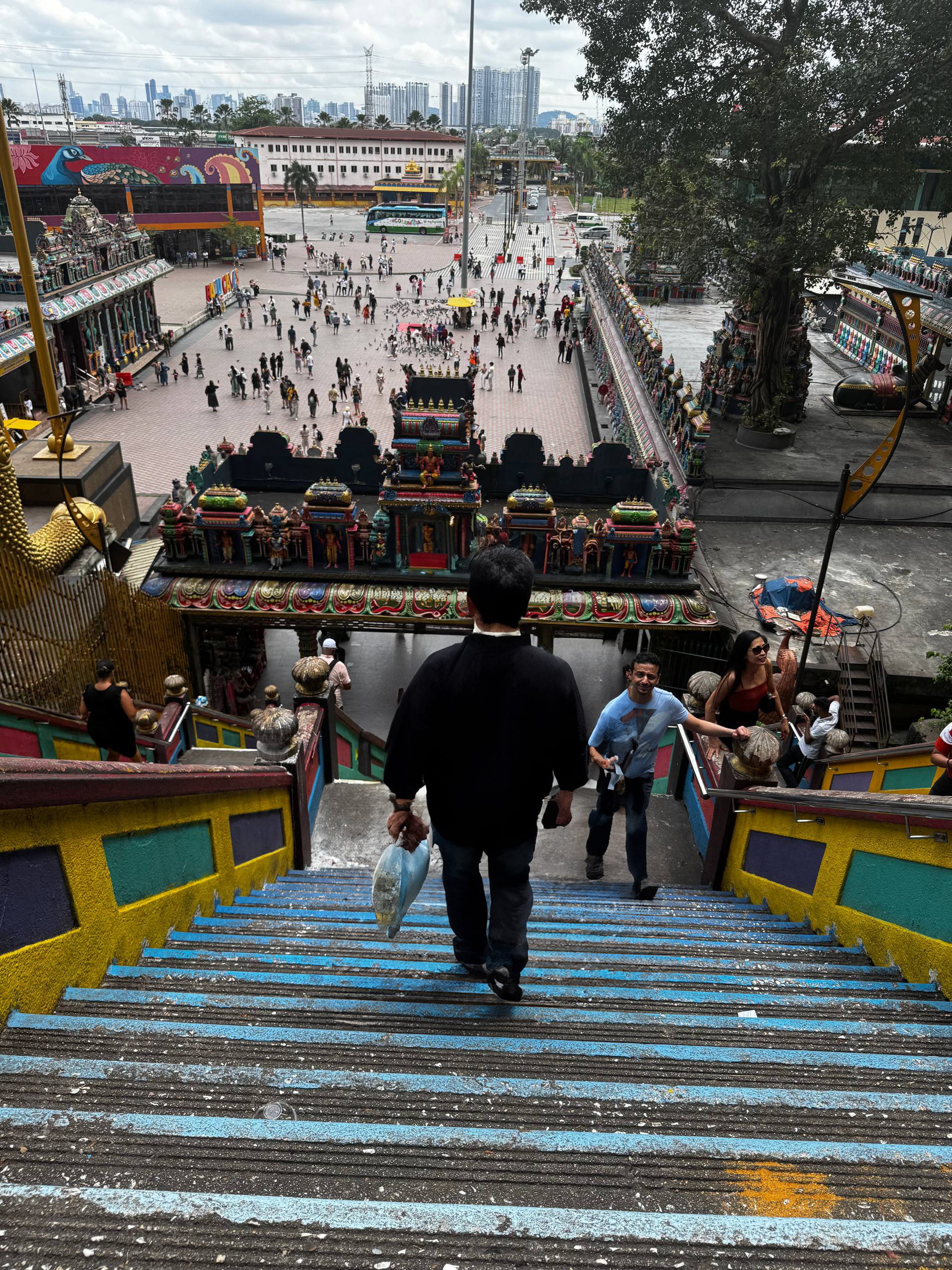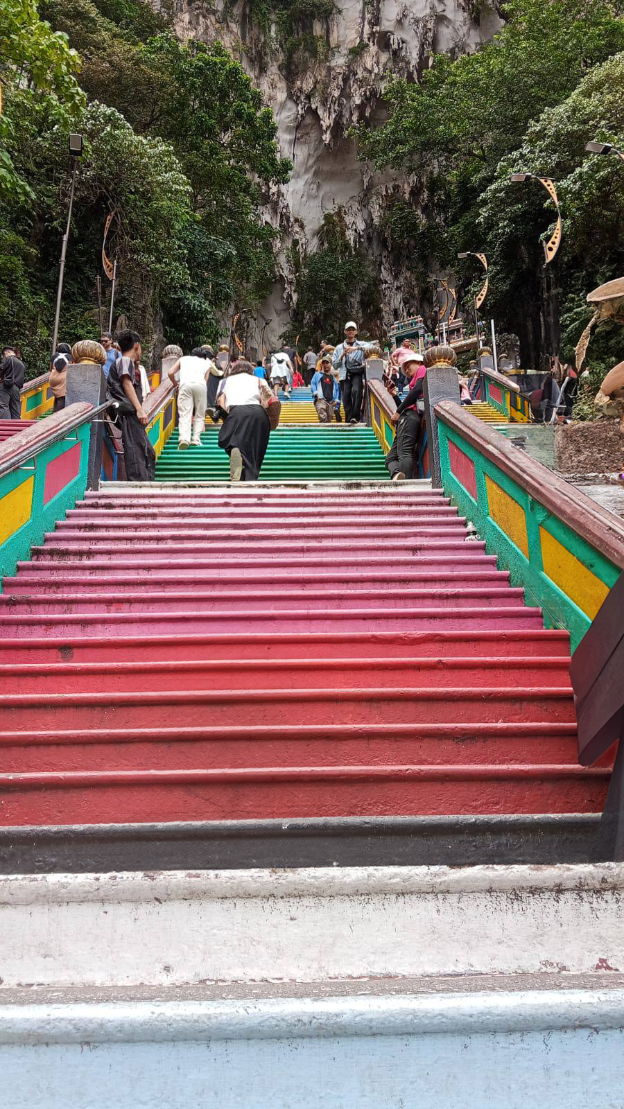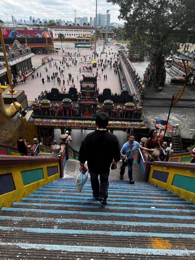 Особенно всё оживает во время фестиваля Тайпусам. Тогда сюда идут десятки, а иногда и сотни тысяч паломников. Многие выполняют обеты, которые со стороны выглядят жёстко и даже пугающе. В эти дни лестница превращается в сплошной поток людей. Тысячи тел, идущих вверх в жаре, в шуме, в молитвах. Подниматься тяжело физически, воздух плотный, движение медленное, и это уже не прогулка, а настоящее испытание, в котором чувствуется не туристическая экзотика, а сила веры и выносливости.