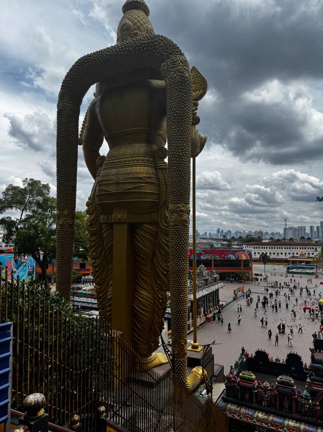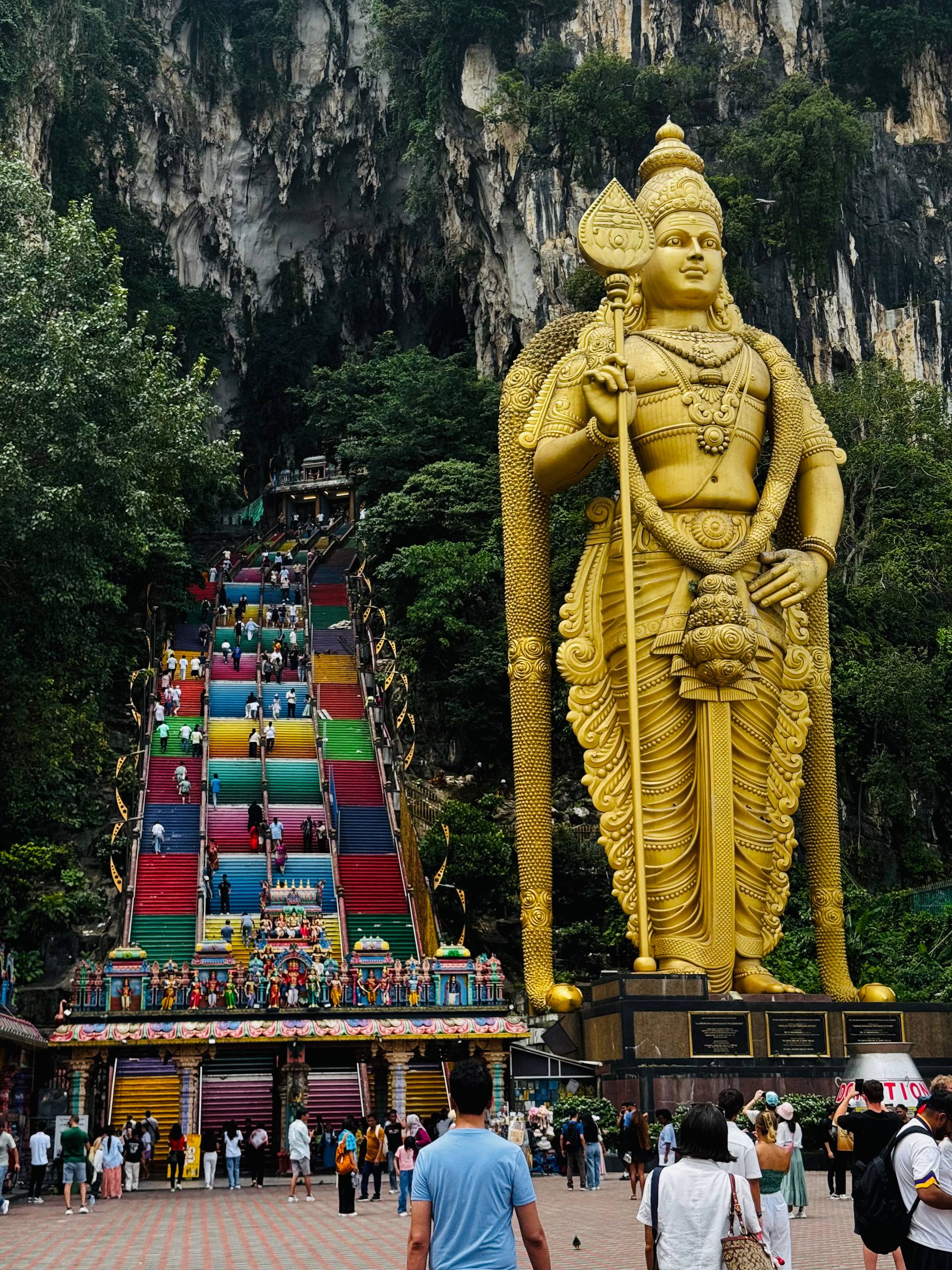 Когда подходишь к Бату-Кейвс, первое, что реально выбивает из привычного масштаба — это золотая статуя Муругана. Огромная золотая фигура Муругана стоит у самого подножия горы, рядом с дорогой, парковкой, торговыми палатками. Это не просто декоративная скульптура для фотографий. Муруган покровитель воинов, сын Шивы, один из центральных богов в тамильской традиции. Его фигура здесь работает как граница между обычным городским пространством и сакральной зоной. Яркое золото под тропическим солнцем слепит глаза, из-за чего статуя кажется почти нереальной, словно сделанной не из металла и бетона, а из света.