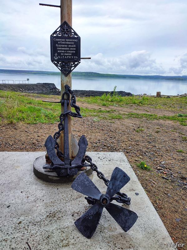 На берегу озера установлена памятная стела. Она сделана по форме озера Чебаркуль. Если смотреть в круглое отверстие, видно как раз то место, куда плюхнулся метеорит. Стела находится на территории яхт-клуба «Парус». Там же реконструкция Чебаркульской крепости. Высунулся охранник, махнул рукой в сторону вывески «Касса», возмутился, что я хожу тут бесплатно, однако, быстро успокоился и удалился восвояси. Рядом с памятником метеориту есть еще памятник озеру Чебаркуль. Надпись гласит: «Славному прошлому и блестящему будущему людей, связавших свою жизнь с озером по имени Чебаркуль».