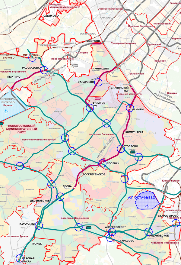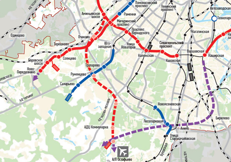 Применительно к главной теме, всё это привело к тому, что в «нулевые» занялись застарелыми вопросами, которые не решались в предыдущие два (иногда и три) десятилетия. По возможности — малой кровью. И с перспективой освоения новых территорий, поскольку старые начали заканчиваться. Вернулись и к проекту метро в Коммунарку, причём практически тем же маршрутом, что был на первой карте выше. Только уже не от «Калужской», а прямо от «Проспекта Вернадского» — сам по себе проект Большого кольца был тогда отложен надолго. Но вот соответствующий кусок с перспективой его будущего продления в сторону Кунцева построить было можно и нужно. А новой линии это давало заодно и пересадки уже на две линии метро. Хотя польза от этого была под вопросом — Сокольническую («красную») линию метро планировалось завести в Новопеределкино, что при висящем в воздухе строительстве Солнцевской могло её забить на 146% прямо от конечной станции.
