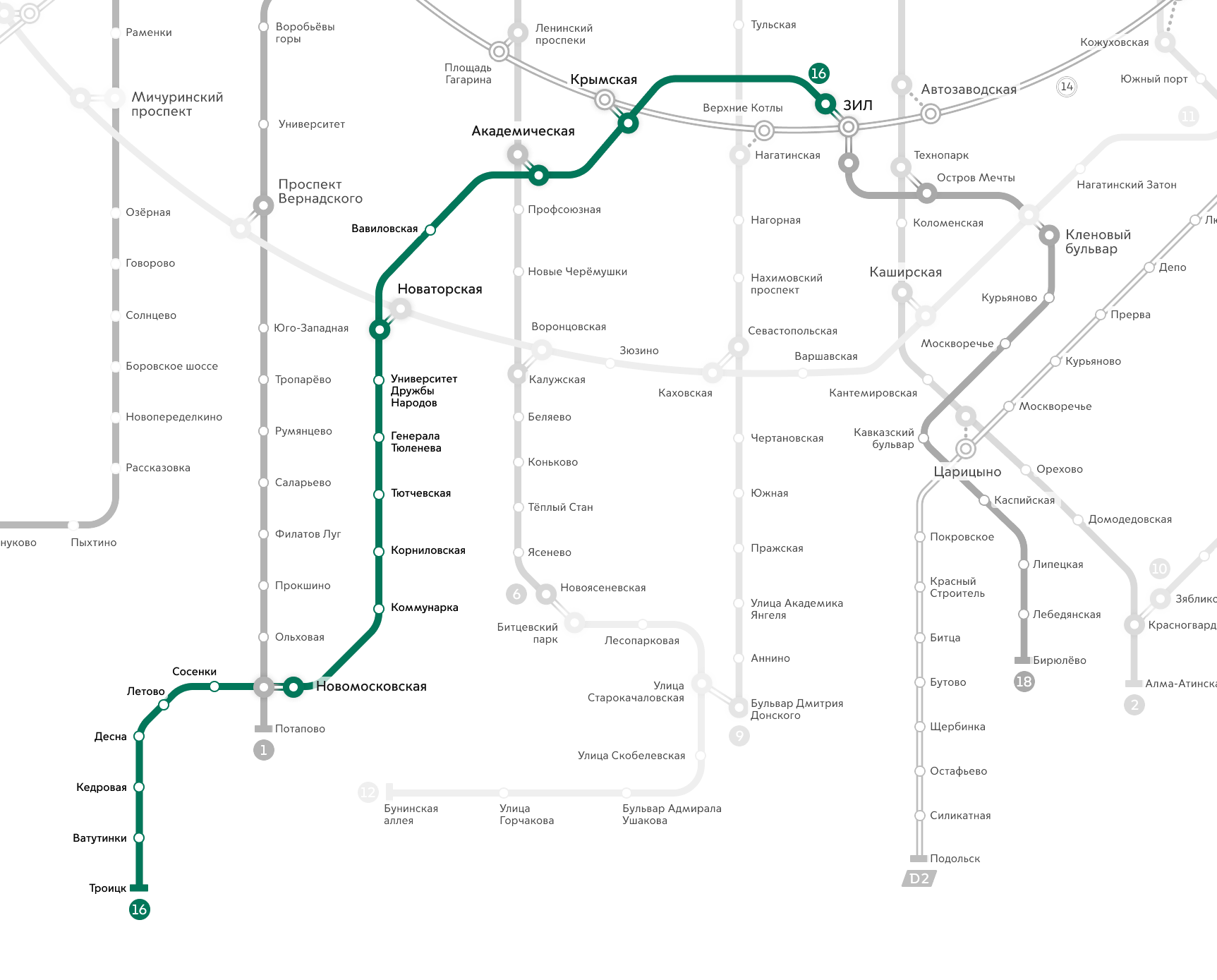 Вот рельсовый каркас юга Москвы и осваиваемого сейчас северного пояса Новой Москвы к 2030 году. Нового — две линии, причём одна (Бирюлевская) в действующих планах целиком расположена в пределах МКАД, а вторая — примерно наполовину. Первую пока отложим в сторонку до следующего раза. И взглянем на текущую обстановку станций соседних двух старых линий.