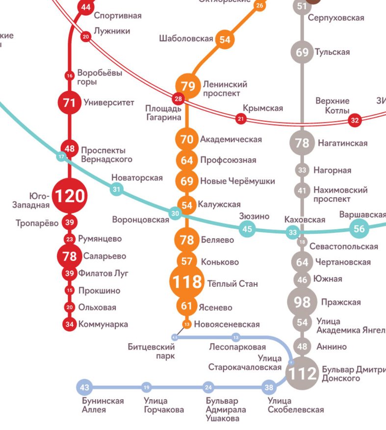 «Выдающиеся» здесь «Юго-Западная» и «Тёплый Стан». Обе уже с осени потеряют порядка 20-25 тысяч пассажиров и войдут в разумные пределы — сейчас это пятая и шестая станции по трафику. Ещё 10-15 тысяч уйдёт с «Беляева**», так что там станет вообще достаточно комфортно. Правда конкретно с линий большая часть пассажиров никуда не денется — всё равно многие поедут через БКЛ на «Калужскую» и «Проспект Вернадского», но перегрузка станций уменьшится. После постройки центрального участка, ещё немного доразгрузят и старые линии. А продление новой до Троицка дополнительно утянет как минимум 50 тысяч человек с тех же «Юго-Западной», «Тёплого Стана» и примкнувшего к ним «Саларьева». Так что можно (пусть и осторожно) прогнозировать, что в ближней перспективе на южных участках Сокольнической и Калужско-Рижской линий пассажиропоток всех станций будет загнан в более-менее нормальные рамки 70-80 тысяч пассажиров в сутки. В общей сложности также эти две линии разгрузятся на 20%, а Бутовская — на 15% (что также уменьшит количество пассажиров на Серпуховско-Тимирязевской). Причём второе будет достигнуто уже после запуска участка до «Новомосковской» — ждать прихода метро в Троицк не обязательно.