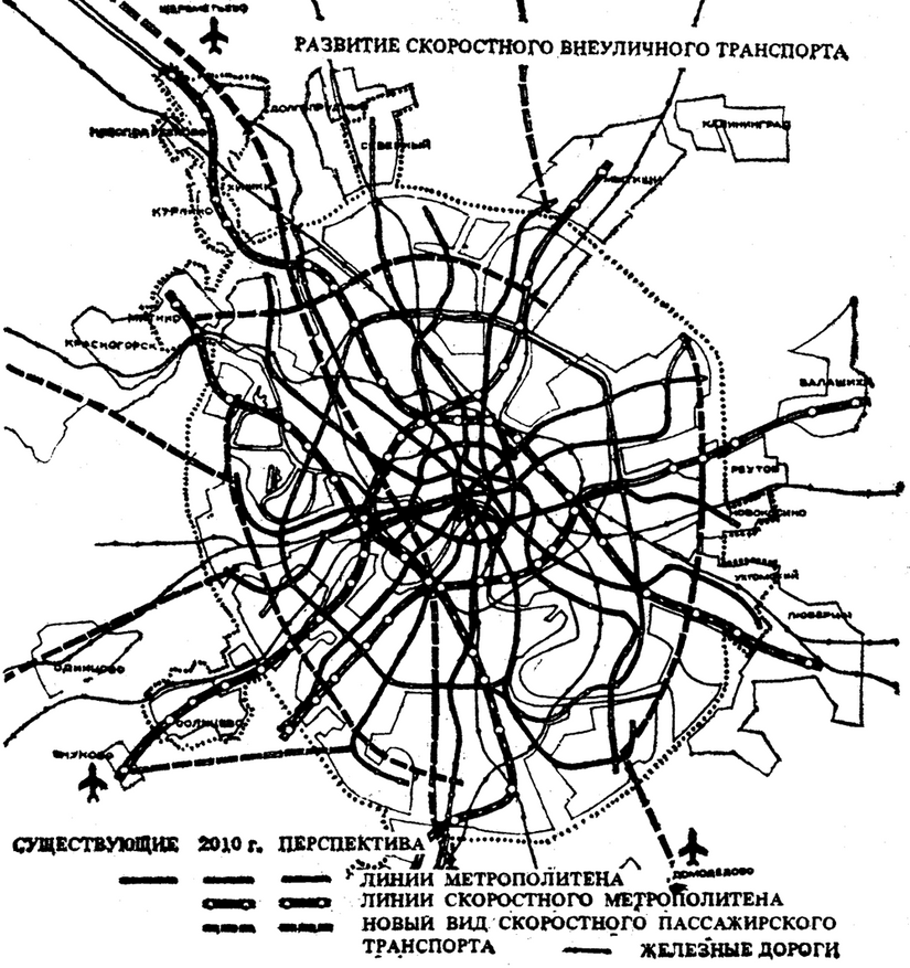 Но в 80-е схему сильно переиграли — освоение Коммунарки было отложено на дальнюю перспективу, а её место в ближней заняли Солнцево и Бутово (также и Митино, но это немного другая история, поскольку совсем в другом направлении). Поэтому ни в один из хордовых проектов линия на Коммунарку не вошла, а в Ясенево просто завернули Калужско-Рижскую («оранжевую») линию, заодно зарубив возможность её продления вдоль Калужского шоссе. Это, да продление Серпуховского радиуса в Бутово — единственное, что из тех планов в этом районе сумели реализовать. Хордовый проект отложился надолго, причём оригинальная задумка, а именно отдельная сеть линий скоростного метро с поездами большой вместимости, вообще приказала долго жить. Некоторые линии почти по тогдашним планам строятся сейчас — но они «обычные» метрошные. Что логично — придумывать новые стандарты и разрабатывать новые поезда и в настоящее время работа сложная. Эксплуатация двух несовместимых друг с другом систем — тоже та ещё радость. Расширять же и дорабатывать одну — дело посильное. А пассажирам по большому счёту разницы нет, как оно там устроено — лишь бы задачу передвигаться быстро и с комфортом решало.