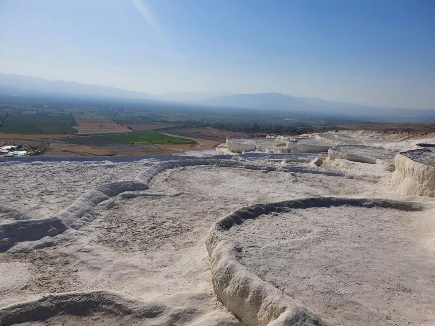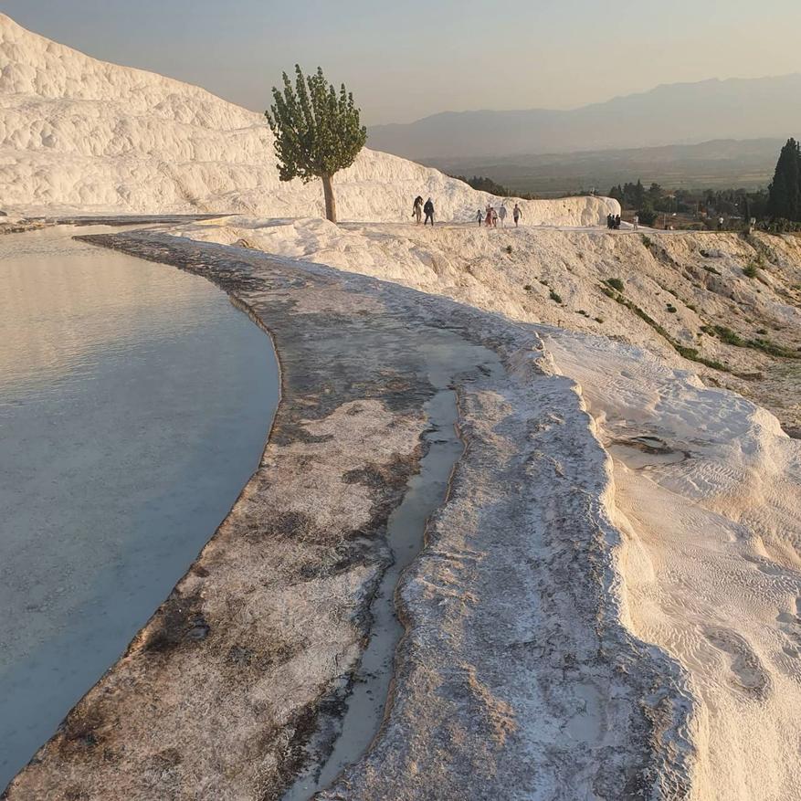 К вопросу о заголовке поста. Паммукале вызывает стойкую ассоциацию с какими-то инопланетными пейзажами. За счёт белого цвета поверхность горы сильно смахивает на то, как в моем представлении может выглядеть луна. Уникальные известняковые террасы ведут к термальным источникам с водой, богатой кальцием. Вода в источниках тёплая 35 градусов, некоторые участки периодически закрывают, чтобы хрупкая горная порода успевала восстанавливаться после наплыва туристов.