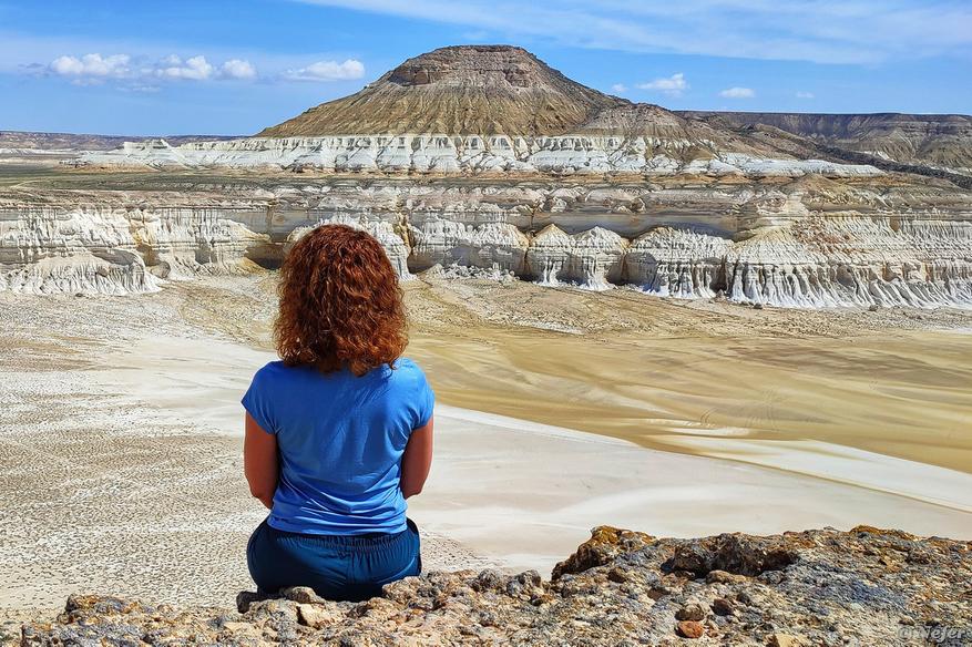 Мангистау — удивительный регион Казахстана, там есть и степи, и море, и скалы. Местами пейзажи драматичны, но скалистая местность Тузбаир, являющаяся частью этого региона, просто завораживает. Едешь-едешь, вдруг степь резко обрывается, впереди пропасть, а внизу белеет солончак. Лучше начать с обзорной площадки, чтобы осмотреть местность сверху и ощутить масштаб.