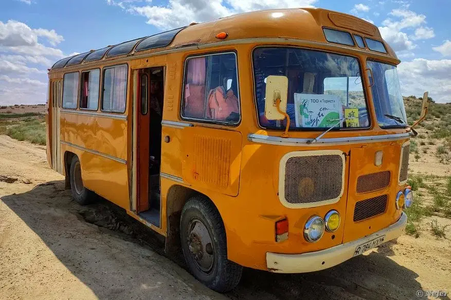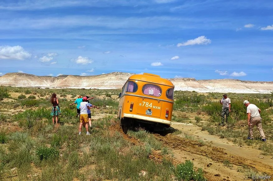 Как мы ехали на солончак — отдельная песня. Накануне были дожди, и дорога размокла. Ну как дорога, укатанный грунт. В основном подсохло, однако, более низкие участки оставались непроезжими. Приходилось искать объезд. Ретроавтобус не наш, мы были на джипах. Удивило, что старый советский автобус полез в такое бездорожье. За рулем сидел горячий пожилой лезгин. Застрял, конечно. Но откопался и вылез.
