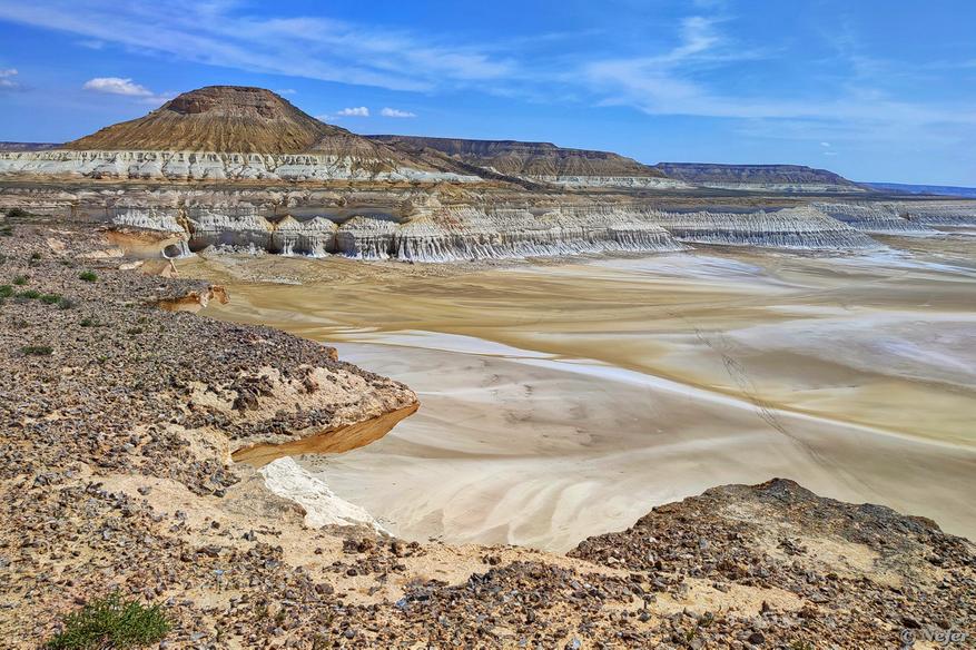 Такие обрывы в Казахстане называют чинками. К самому краю подходить опасно, там карнизы, на фото как раз видно. Когда-то здесь было море, еще раньше океан. Сейчас огромный солончак, по-казахски «сор». Так и говорят: сор Тузбаир.