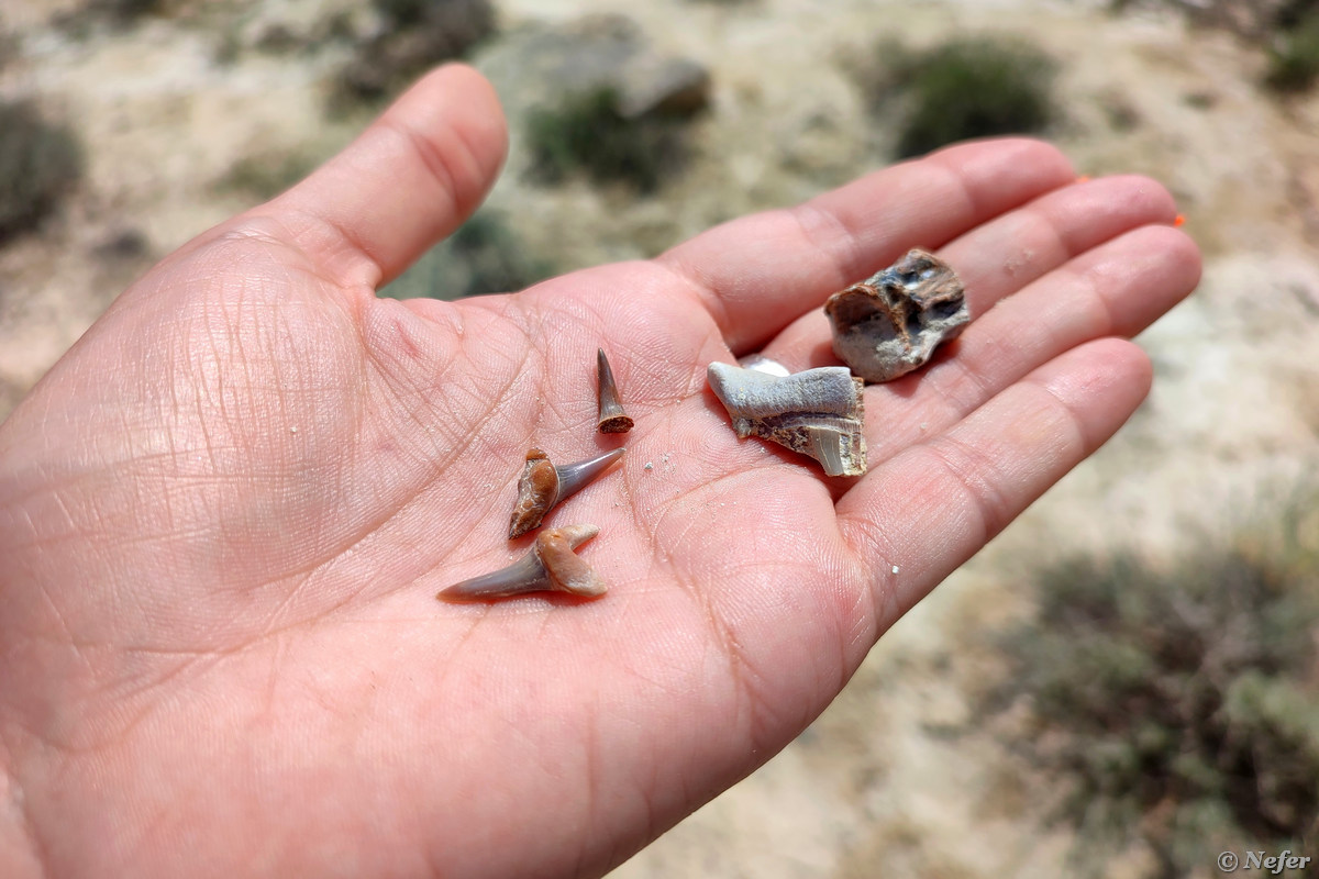 Кроме своего необычного вида, локация интересна тем, что у подножия скалы можно найти зубы древних акул! И это не маркетинговая уловка местных гидов. Кто-то маленькие, кто-то обломанные, но находят почти все. Важно знать, как выглядит зуб акулы, тогда поиск происходит успешнее. Самые удачливые выискивают большие зубы. Такие иногда продают на Авито за несколько сотен долларов. Мой личный улов: один идеальный маленький зуб, маленький зуб с обломанным корнем, просто зуб без корней вообще, нижняя часть большого зуба и позвонок. Это за 20 минут.