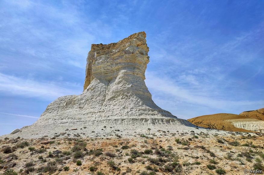 По пути вниз посмотрели еще один объект. Стоит такая одинокая белая скала в степи. Ее называют «Сфинксом». Если смотреть сбоку, пожалуй, действительно отдаленно напоминает.