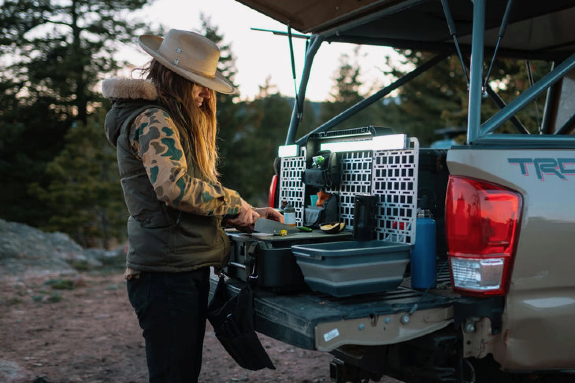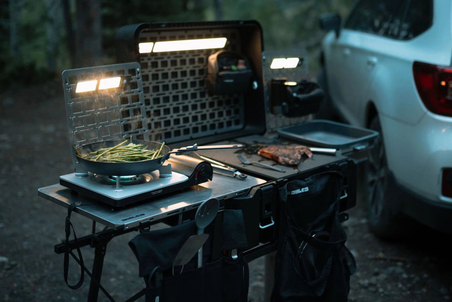 Установка Dialed Camp Kitchen занимает минимум времени и не требует специальных навыков: достаточно раскрыть подставку, установить на нее корпус, выдвинуть плиту и прикрепить дополнительные элементы — боковые панели, раковину и смеситель.