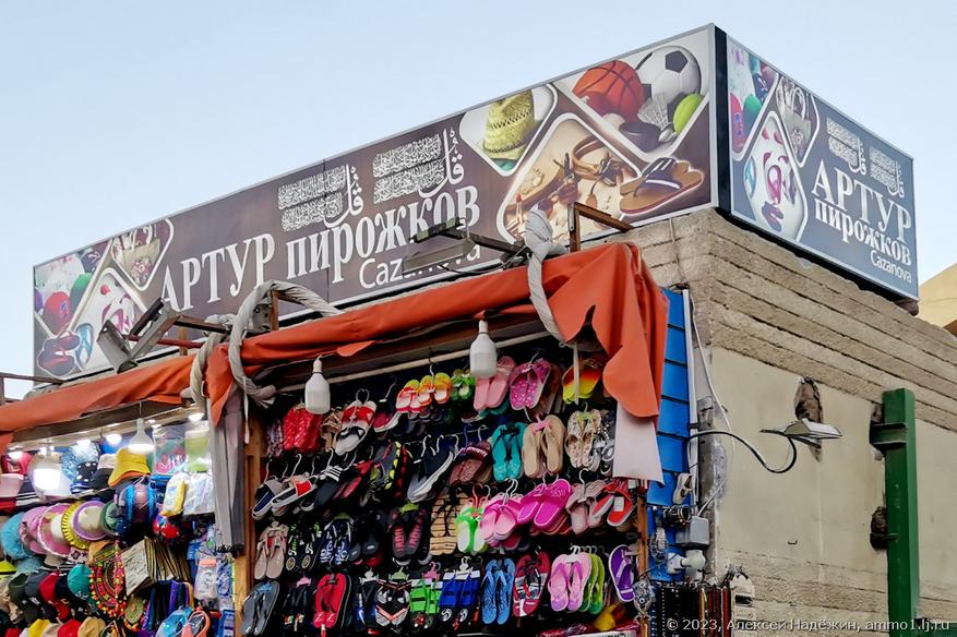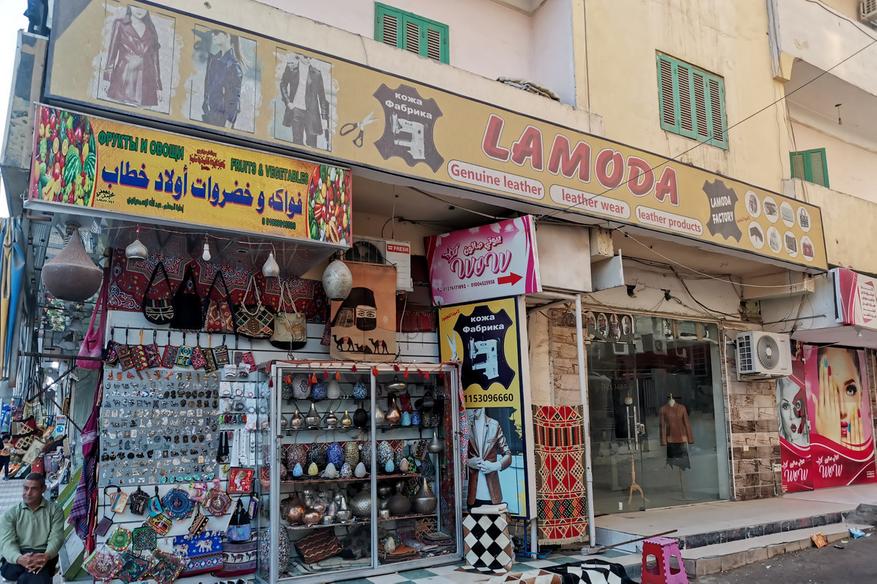 Большинство туристов в Хургаде русскоязычные, поэтому некоторые местные продавцы думают, что если назвать магазин по-русски, да ещё и каким-то словом, знакомым туристу, покупать будут больше. Названия часто получаются смешными, а иногда и глупыми.