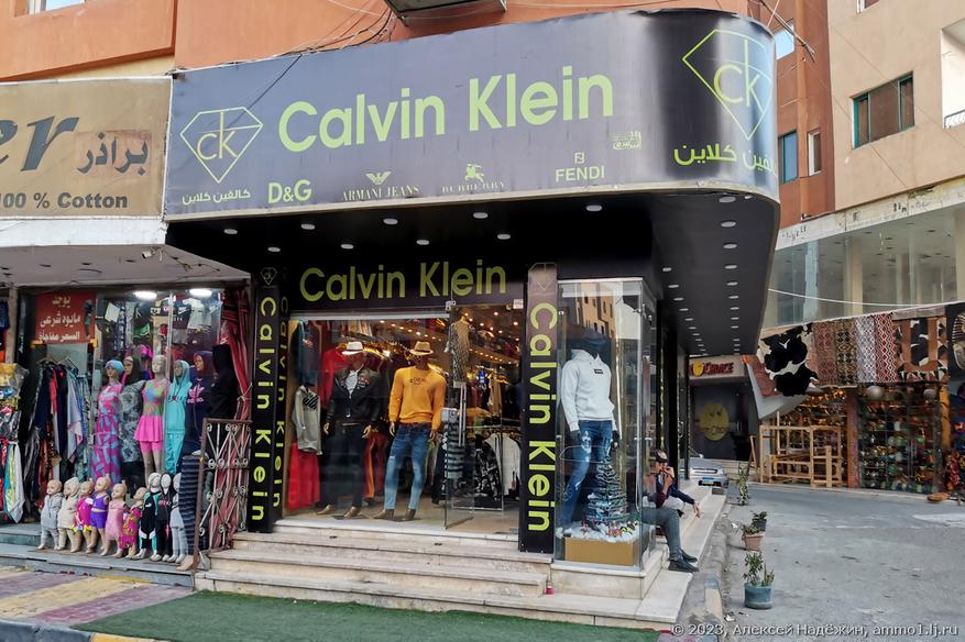 Вот типа фирменный магазин Calvin Klain (но на всякий случай владелец написал на вывеске ещё пяток брендов). Подобных магазинов, названных именами известных брендов довольно много, даже "IKEA", торгующая папирусами и сувенирами есть. Ещё один магазин назвали "в честь" Lamoda.