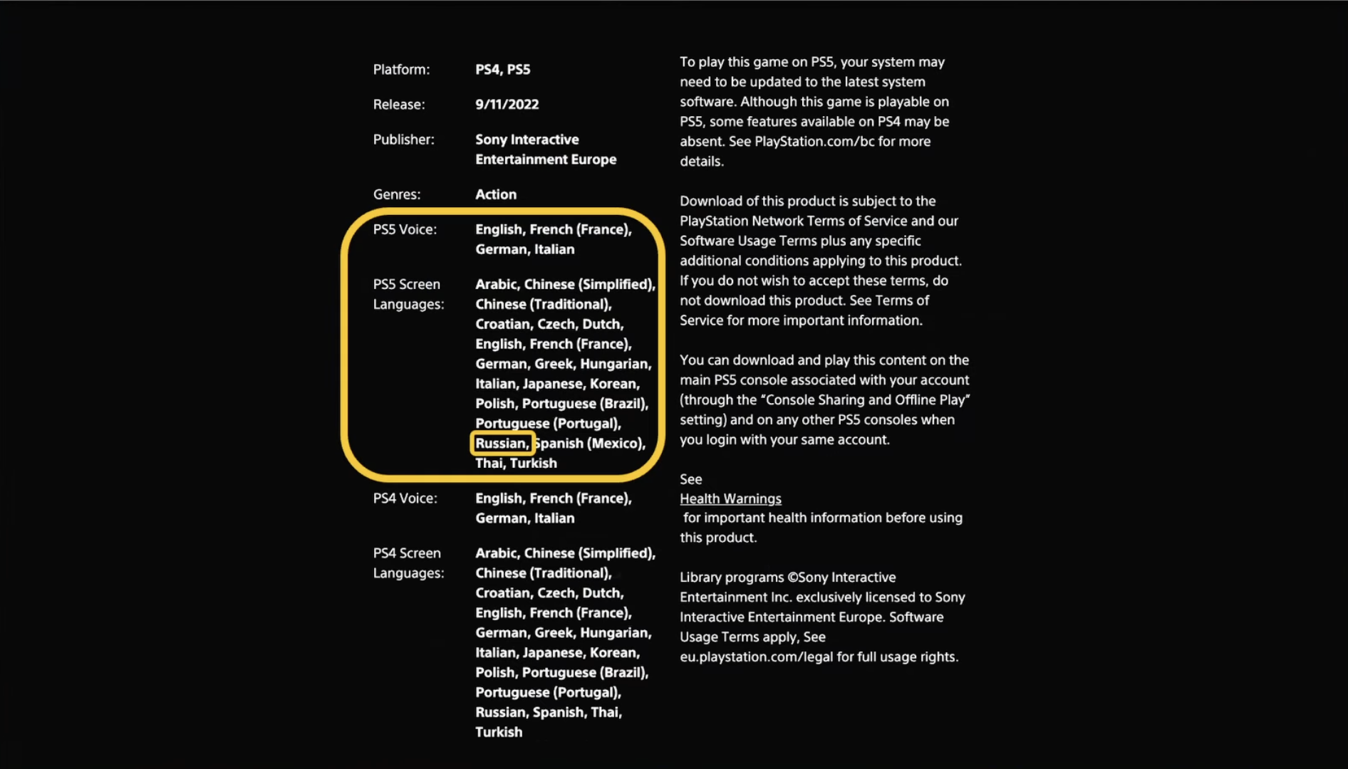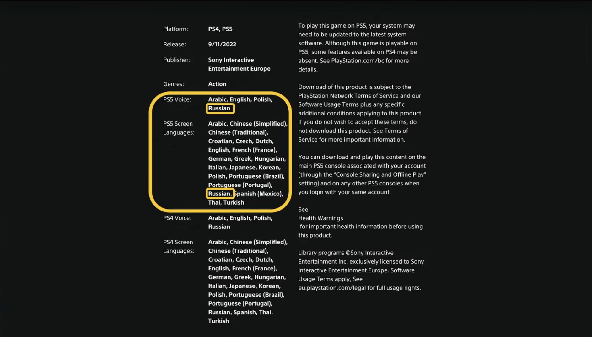 Вы можете выбрать любой язык в настройках консоли, но если в конкретной версии игры русский не предусмотрен, он просто не появится. Это не баг и не ошибка, а особенность экосистемы PlayStation.