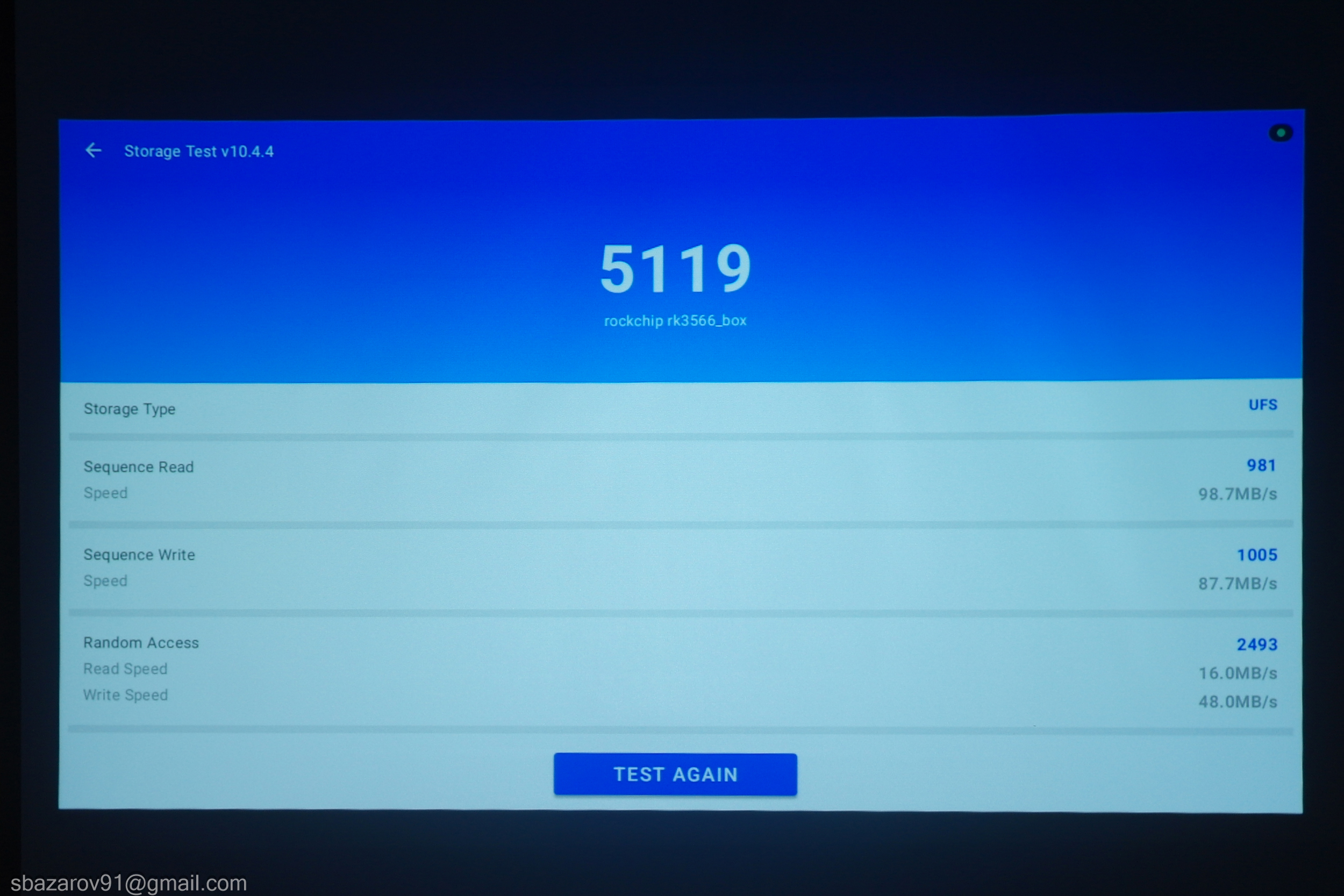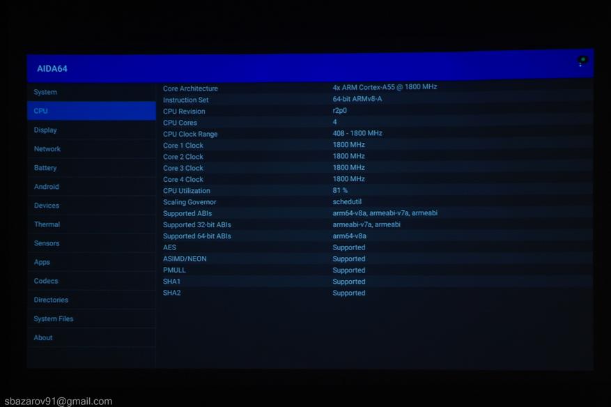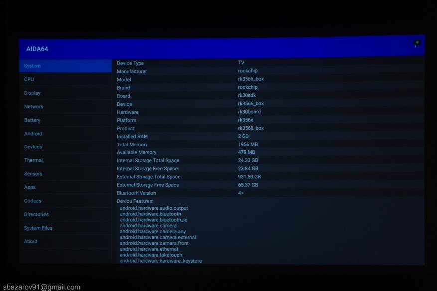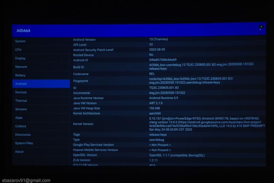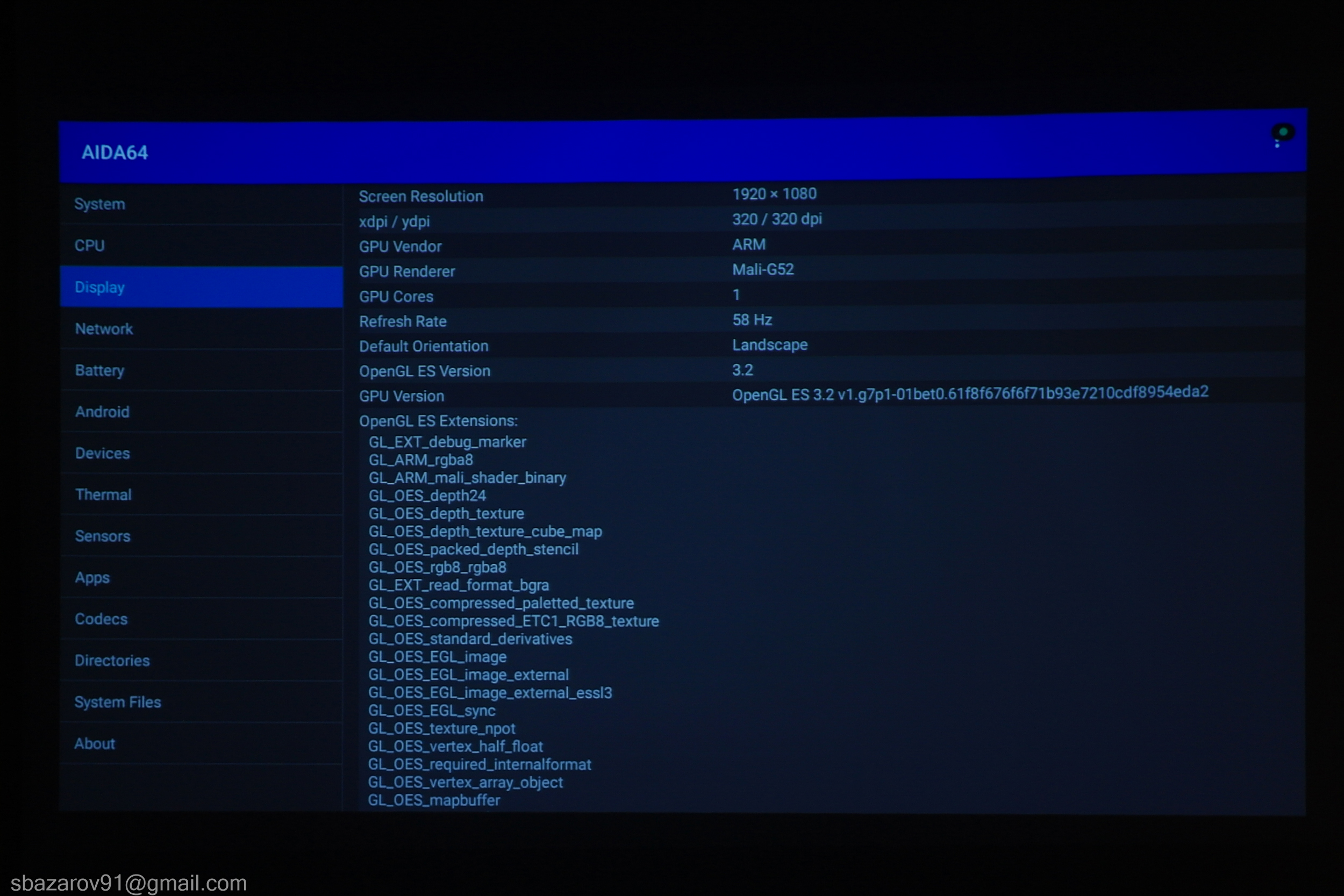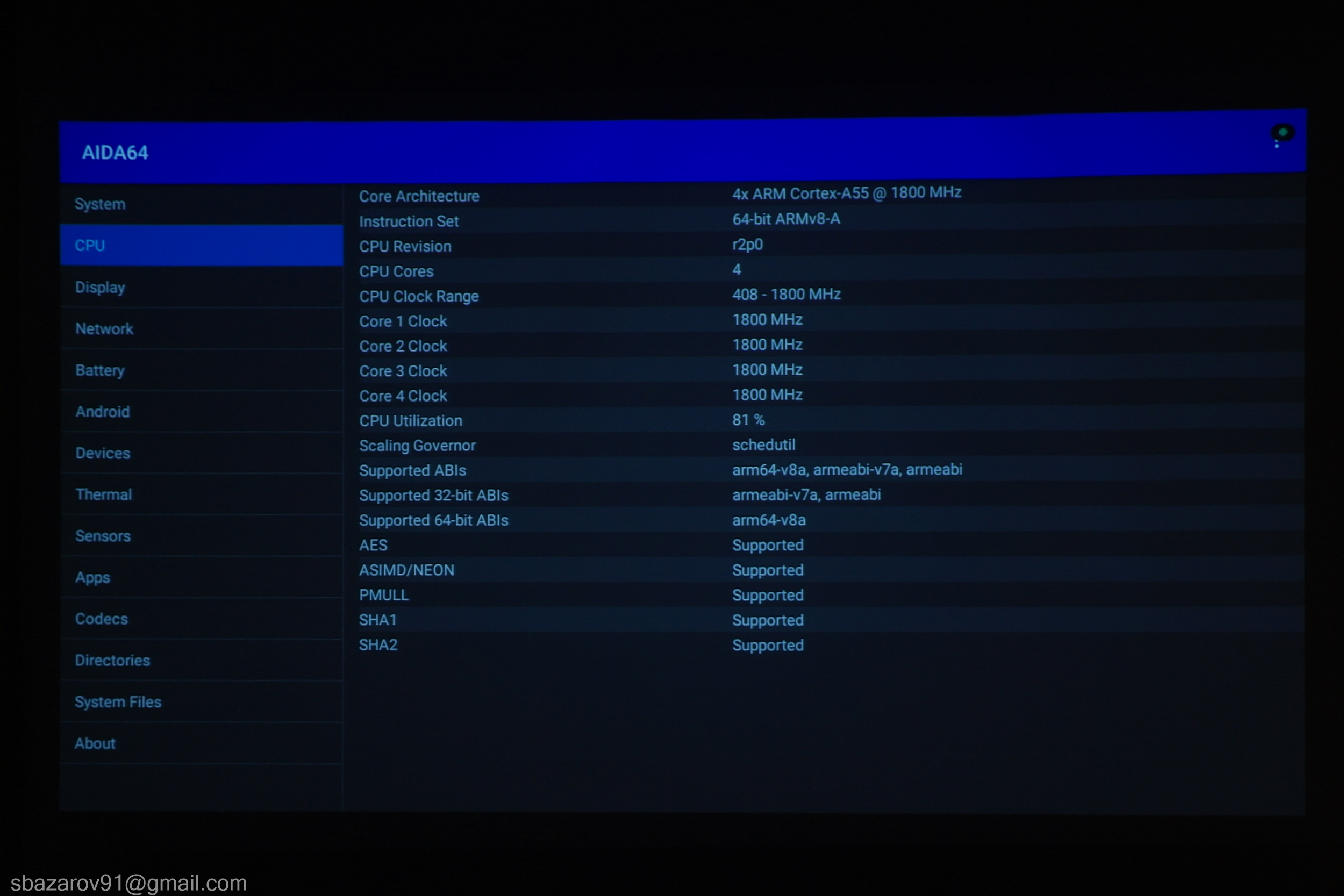 Сердцем проектора служит Rockchip RK3566 — 4-ядерный процессор, состоящий из ядер Cortex-A55 с максимальной частотой 1800 МГц и видеоядра Mali-G52. Производительность процессора — 83 275 очков в AnTuTu 10. Объем оперативной памяти — 2 ГБ, внутреннего накопителя — 32 ГБ. Данный CPU умеет работать с 4К-видео с поддержкой HDR10. Подробнее о системе глазами AIDA64:
