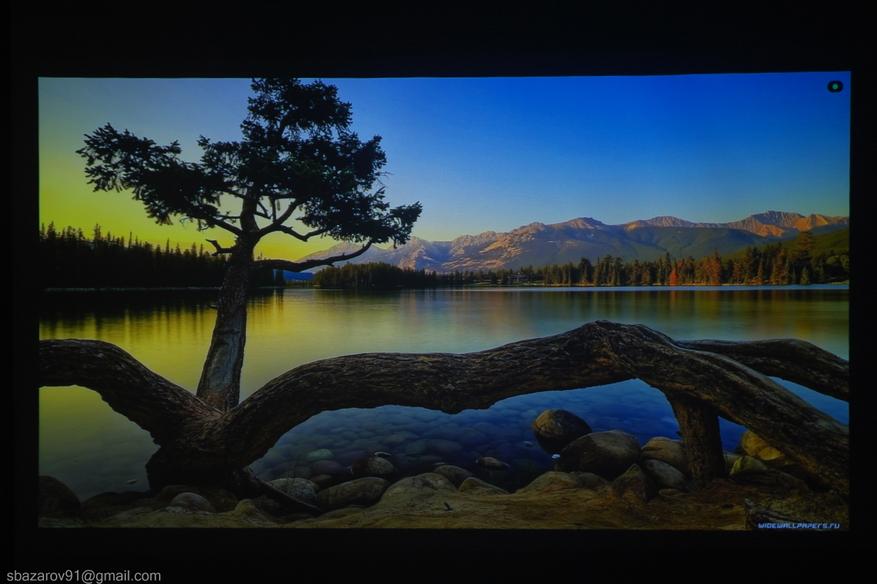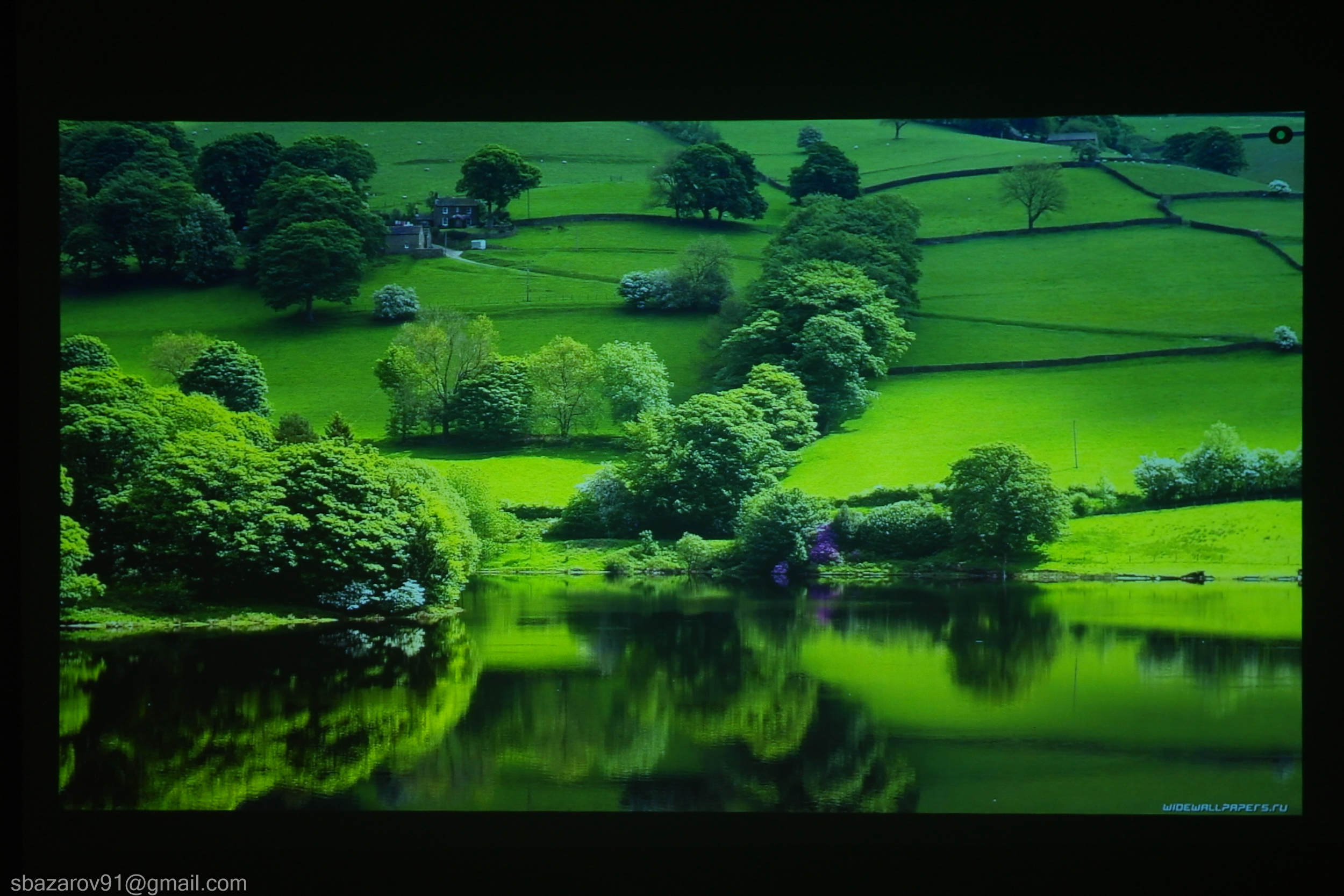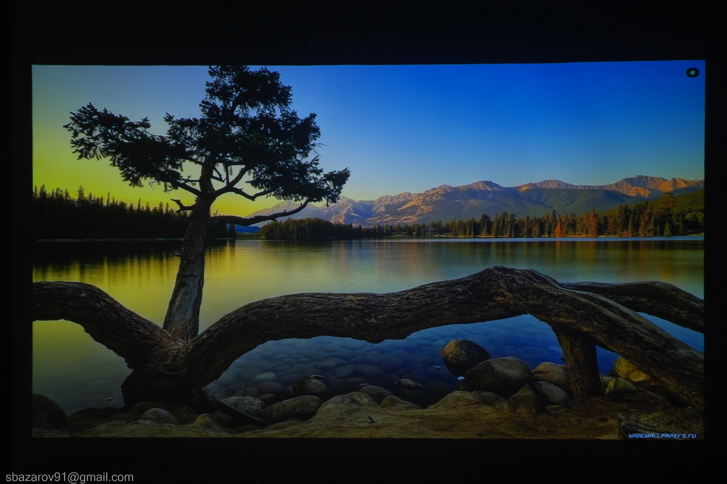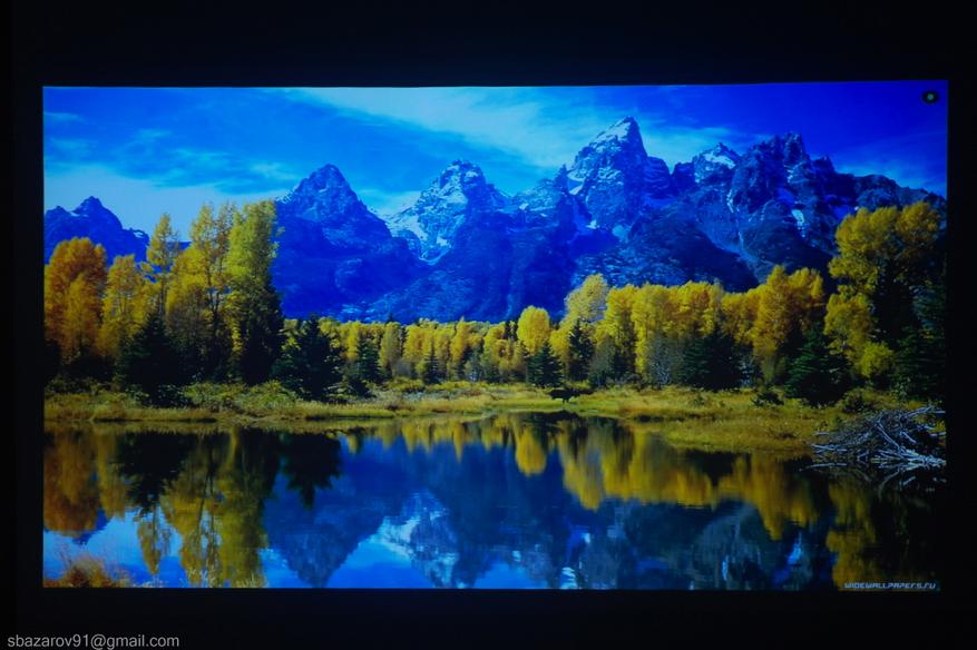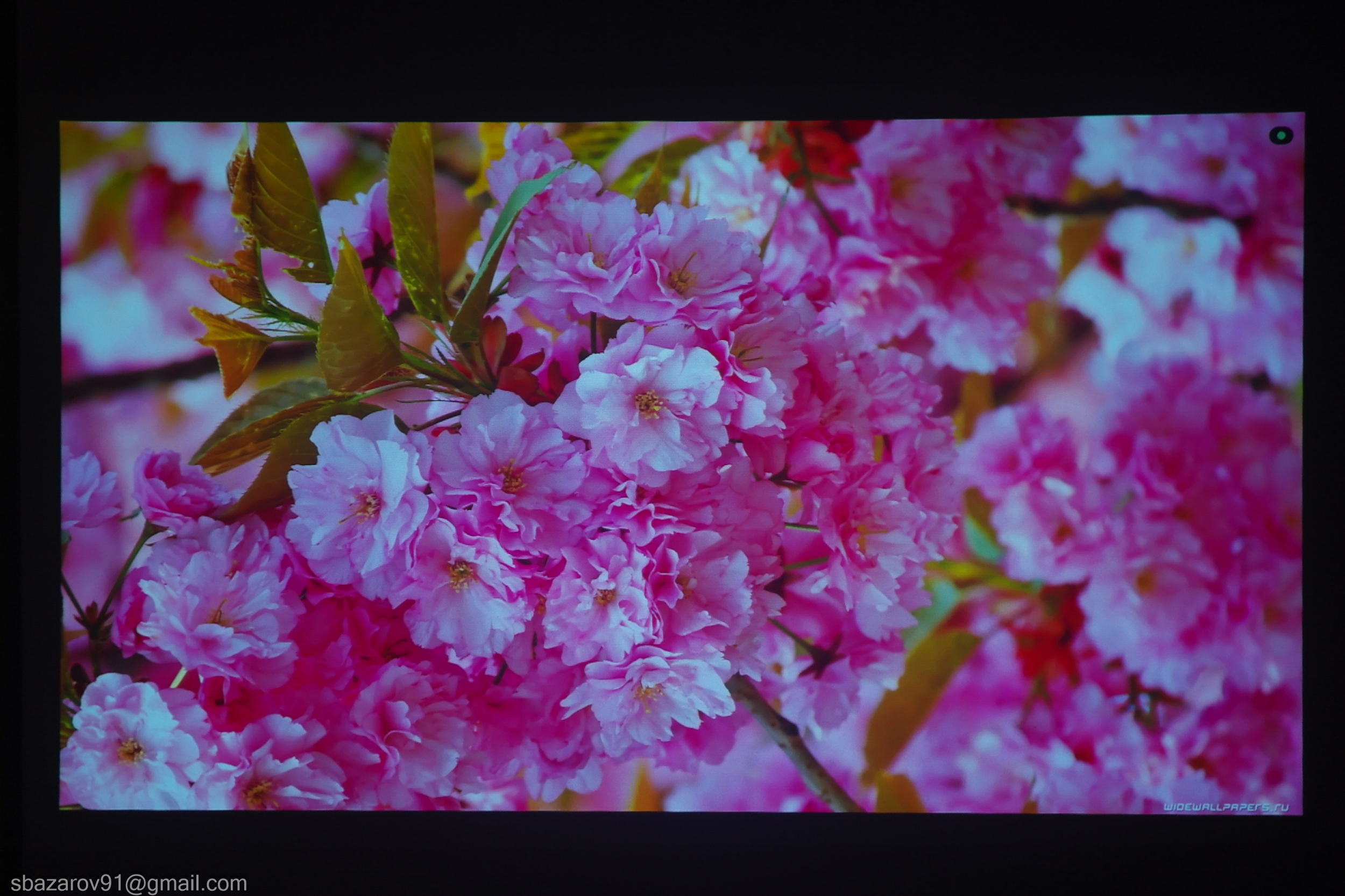 В заключении посмотрим на изображение с максимальной яркостью при различном освещении: первое изображение — полная темнота, второе — дополнительная подсветка над экраном, третье — полностью включенное комнатное освещение. Для комфортного просмотра различного контента лучше использовать блэкаут шторы или дождаться вечера.