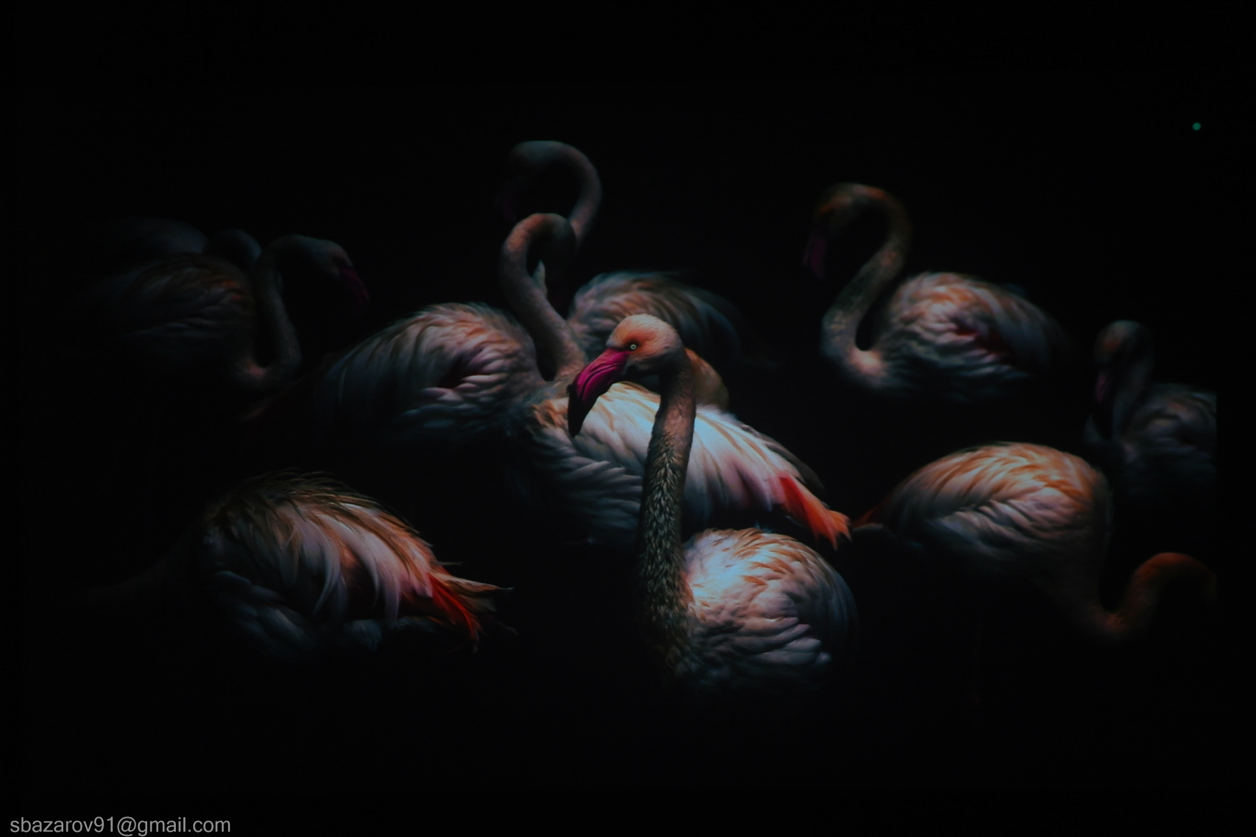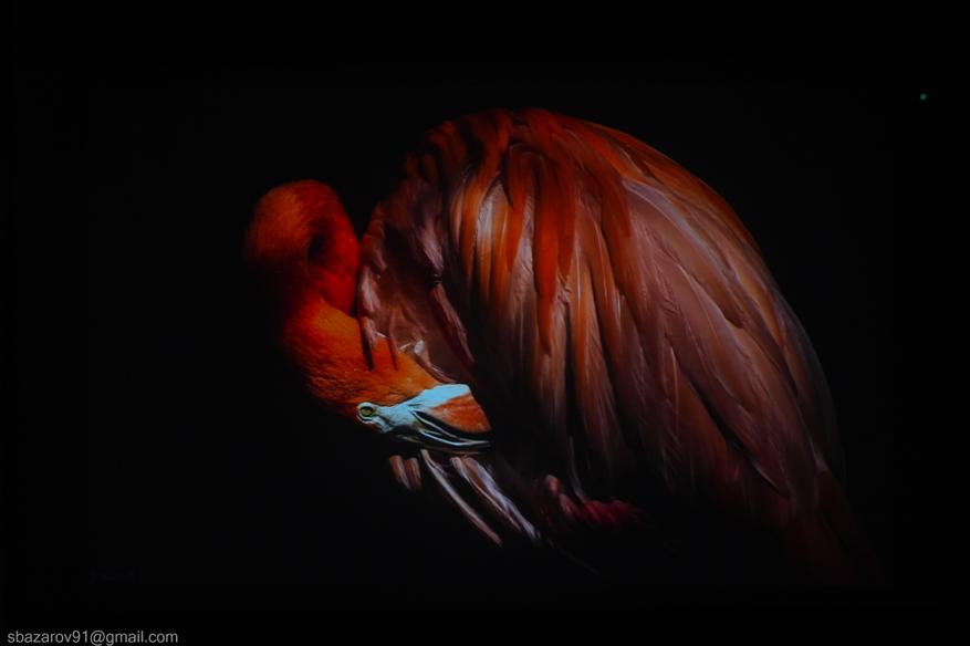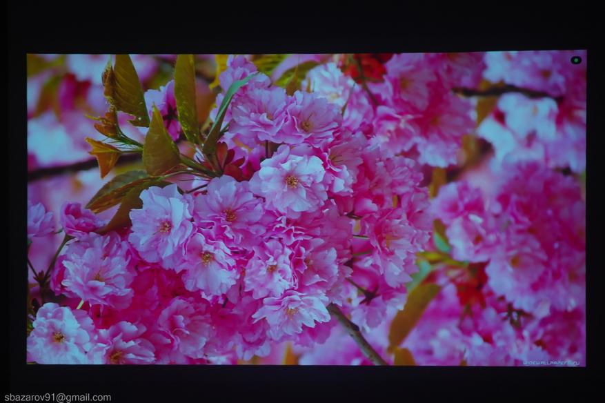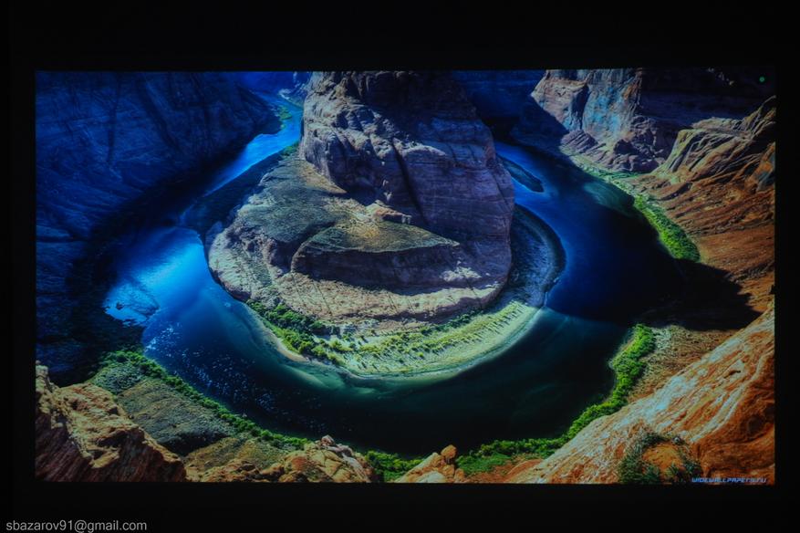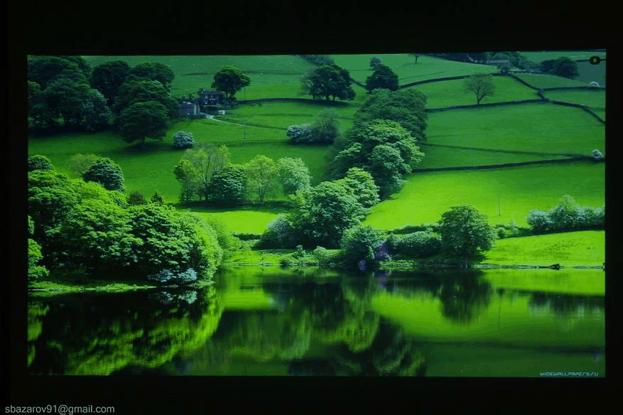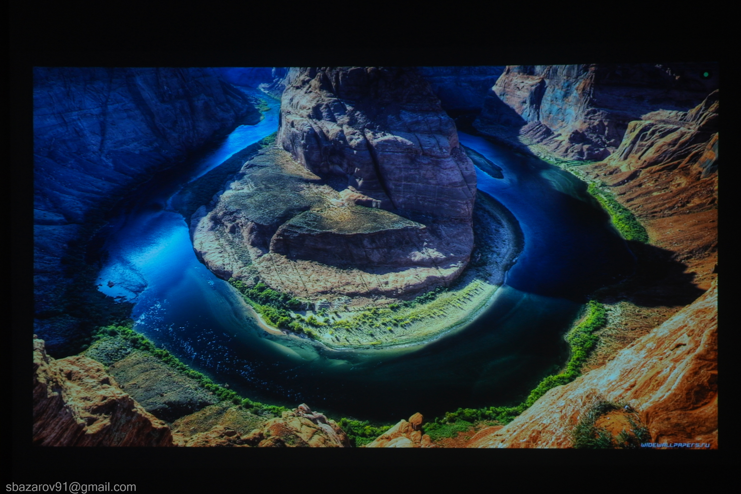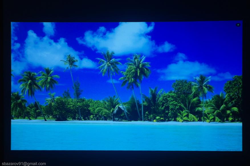 В заключении посмотрим на изображение с максимальной яркостью при различном освещении: первое изображение — полная темнота, второе — дополнительная подсветка над экраном, третье — полностью включенное комнатное освещение. Для комфортного просмотра различного контента лучше использовать блэкаут шторы или дождаться вечера.