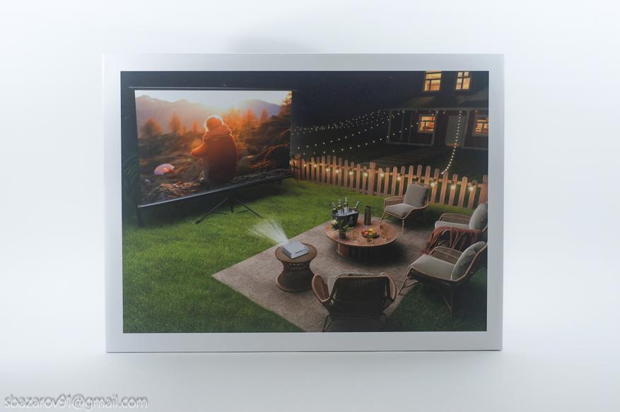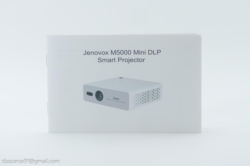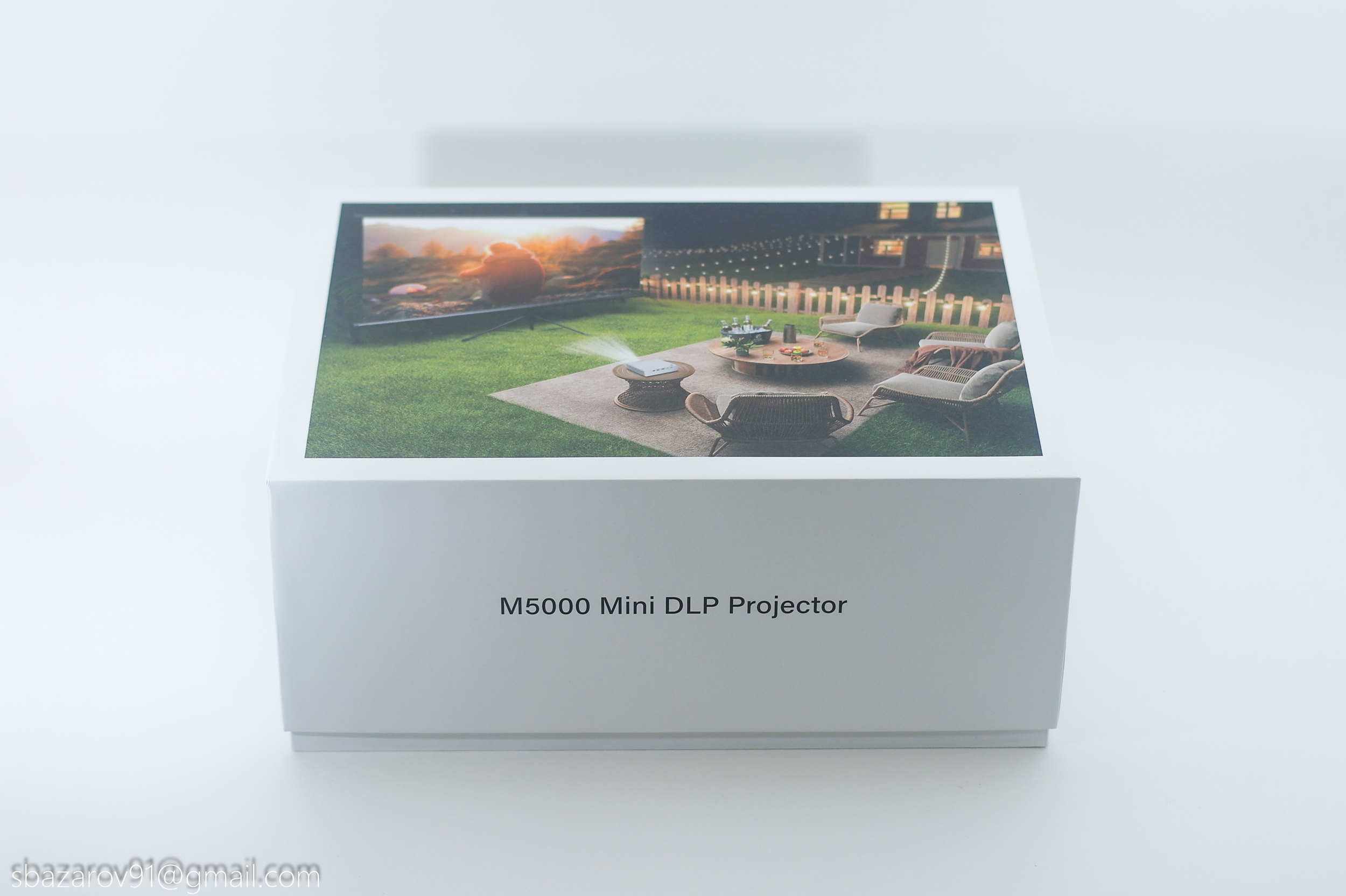 При покупке Jenovox M5000 mini мы получаем скромную и лаконичную упаковку с изображением главной особенности проектора — работы на встроенном аккумуляторе.