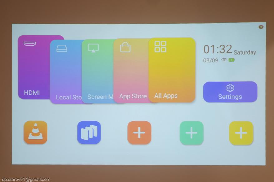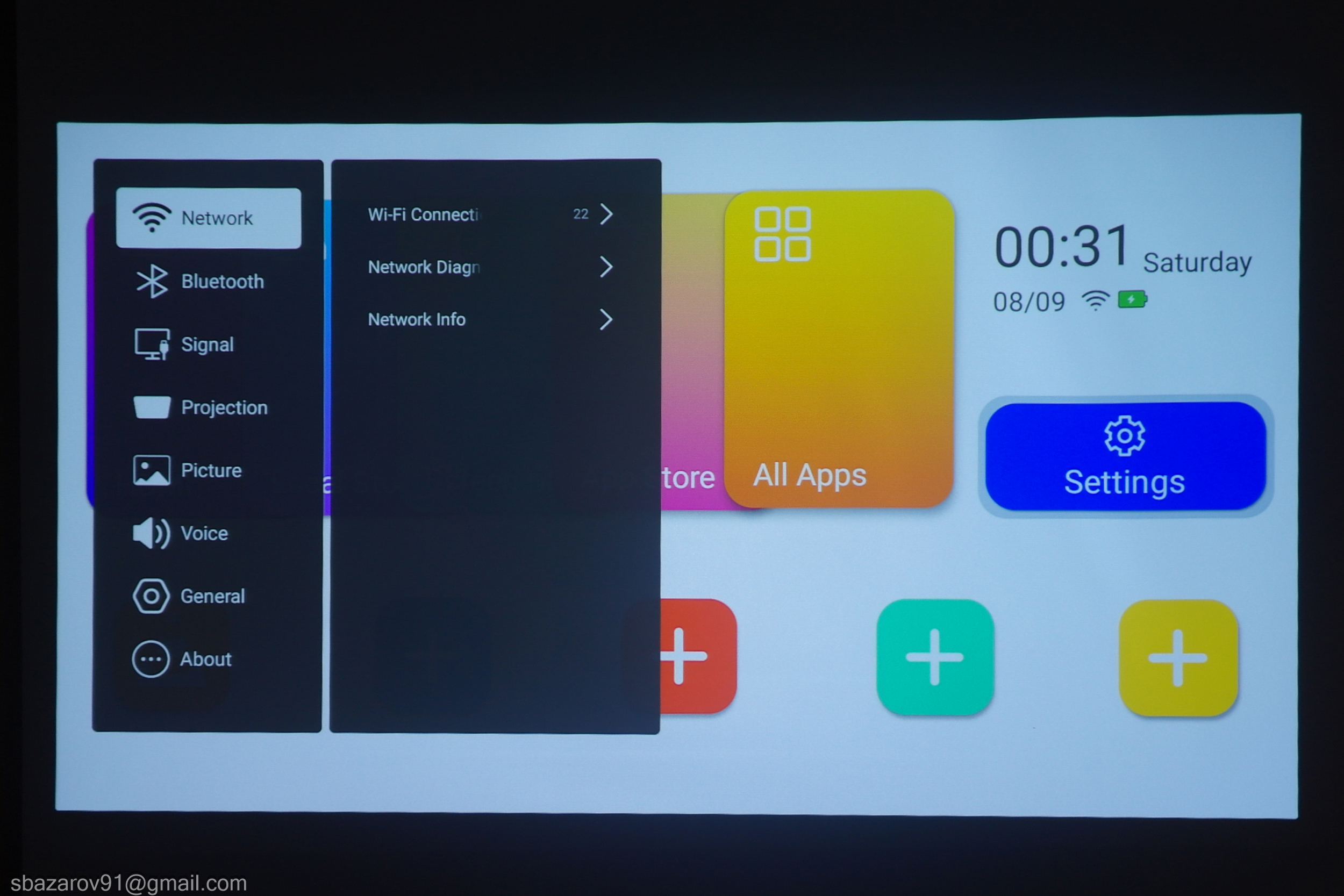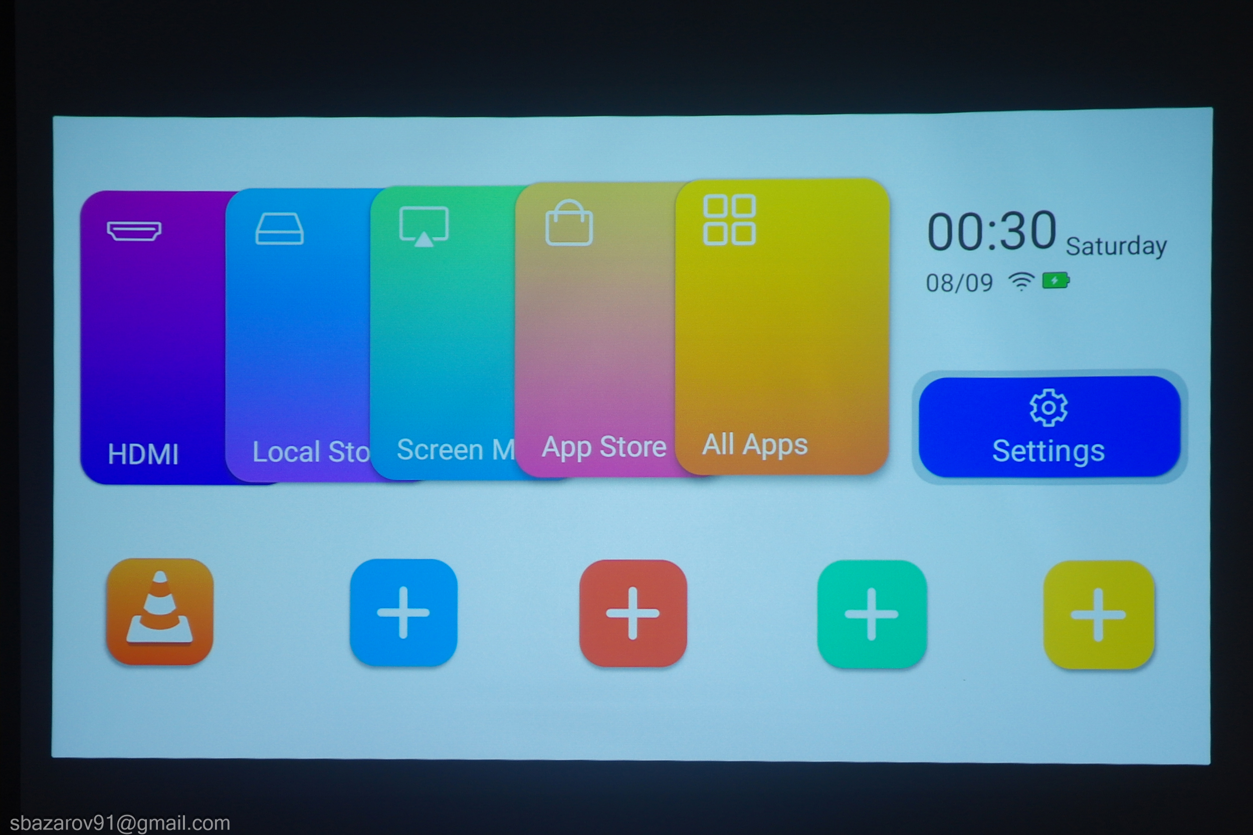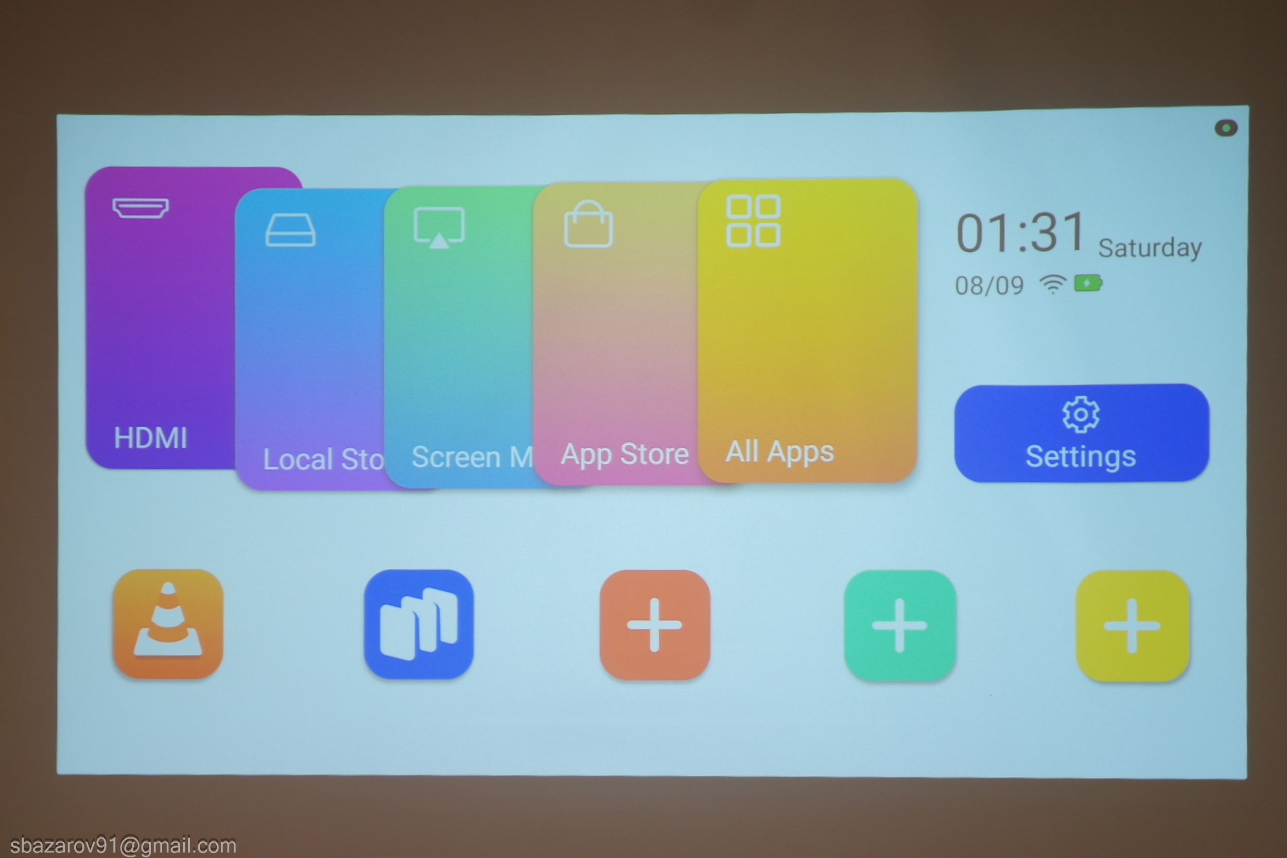 Как итог, несмотря на емкий аккумулятор на 9000 мАxч, время работы не утешительное — около 2 часов и это на минимальной яркости. Если же стоит задача посмотреть любимый фильм где-то на природе, то заряда хватит с лихвой! На максимальной яркости проектор способен проработать не более 20-25 минут.