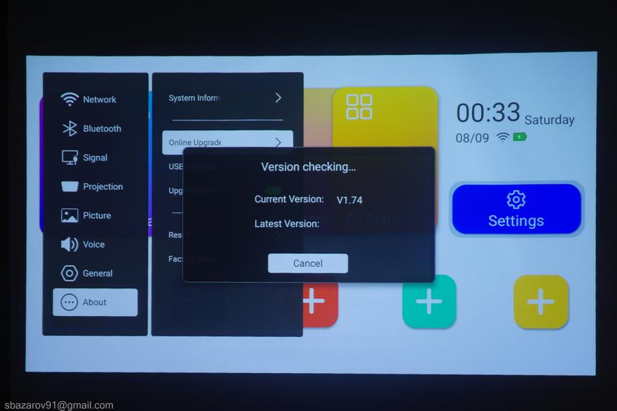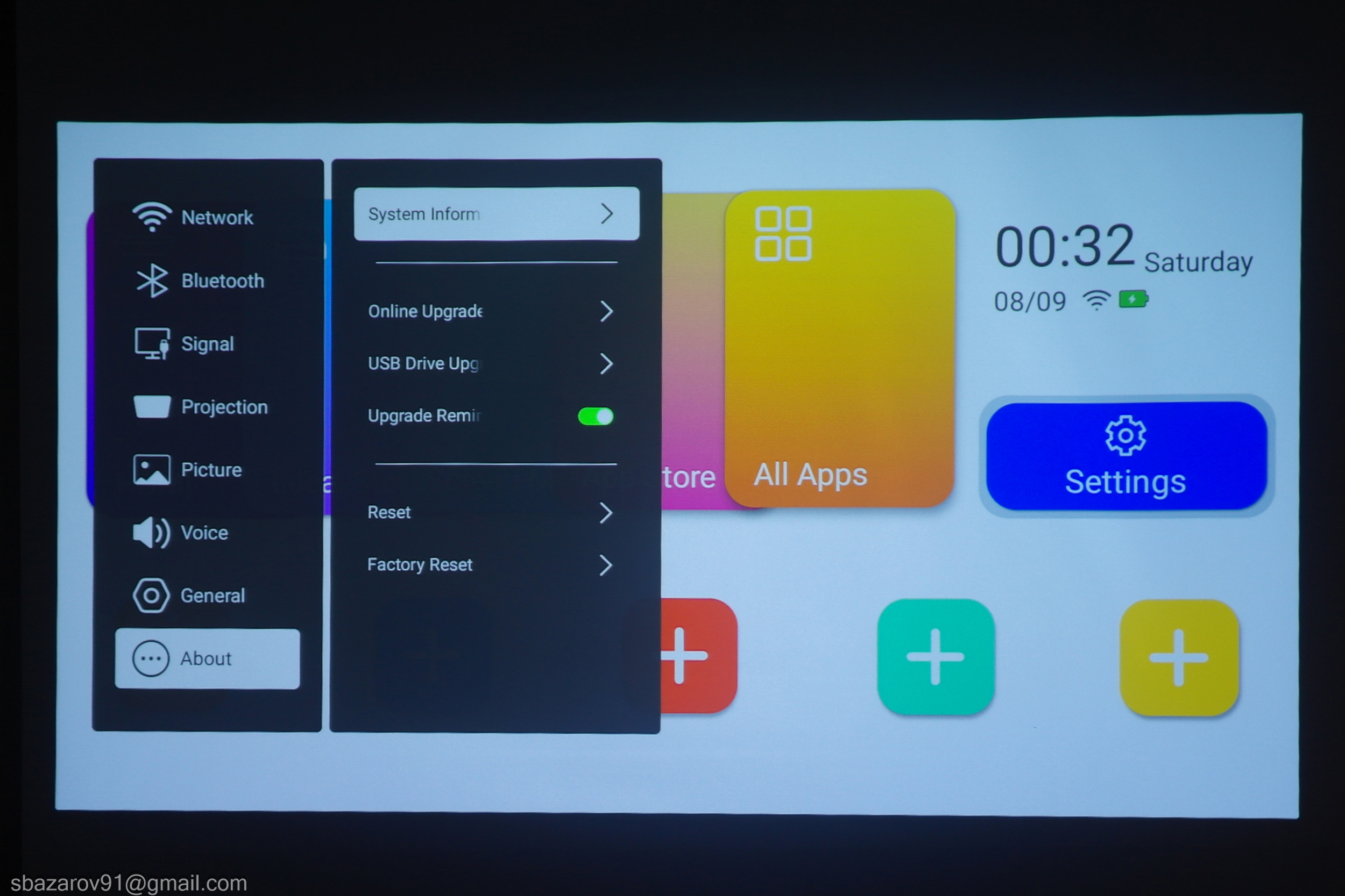- About — системная информация, онлайн- и USB-обновление ПО, сброс проектора до заводских настроек.