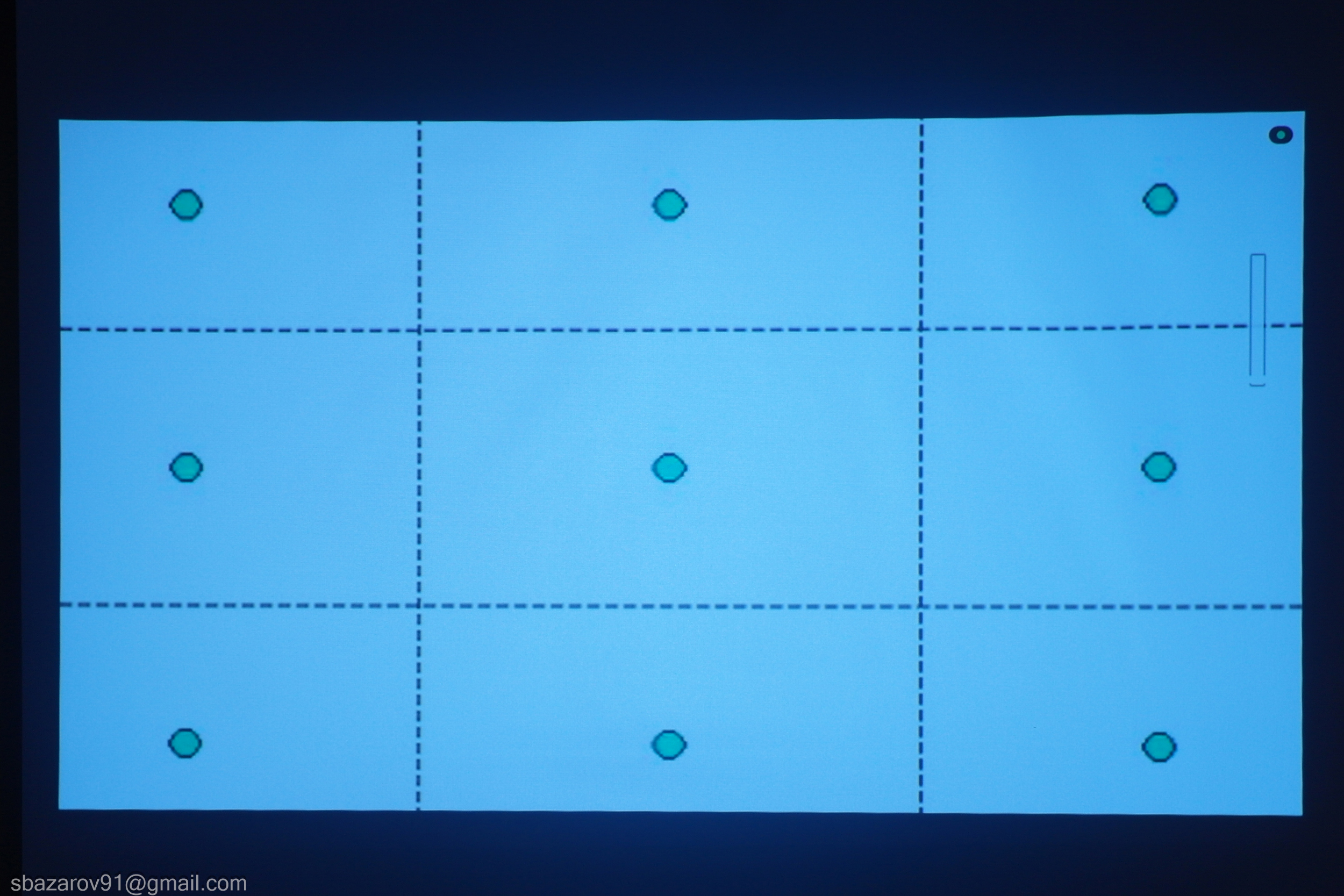 Замер будет происходить на светоотражающем полотне HIPER CINEMA STP 4x3 со 79-дюймовой проекцией (соотношение 16:9) на расстоянии 2,5 метров. В качестве люксметра выступает Opple Light Master и тестовое изображение с 9 точками.