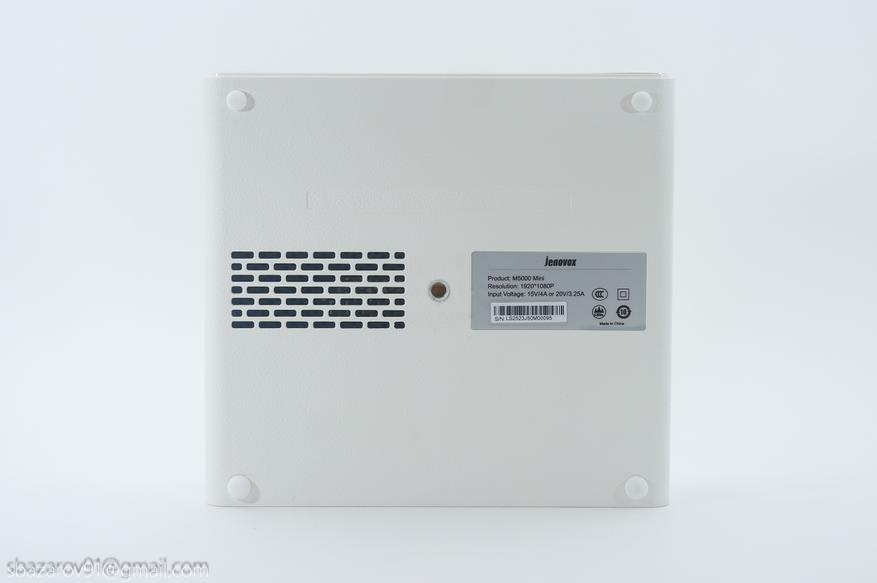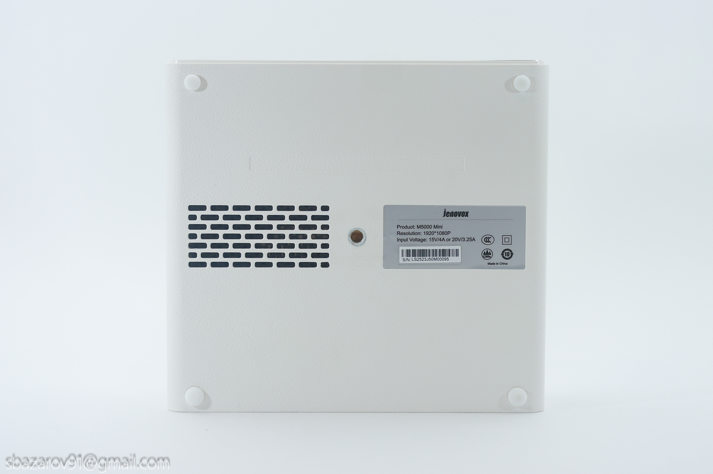 В нижней части проектора находятся 4 резиновых ножки, вентиляционная решетка для забора воздуха, резьба 1/4″ для установки на штатив и наклейка с серийным номером.