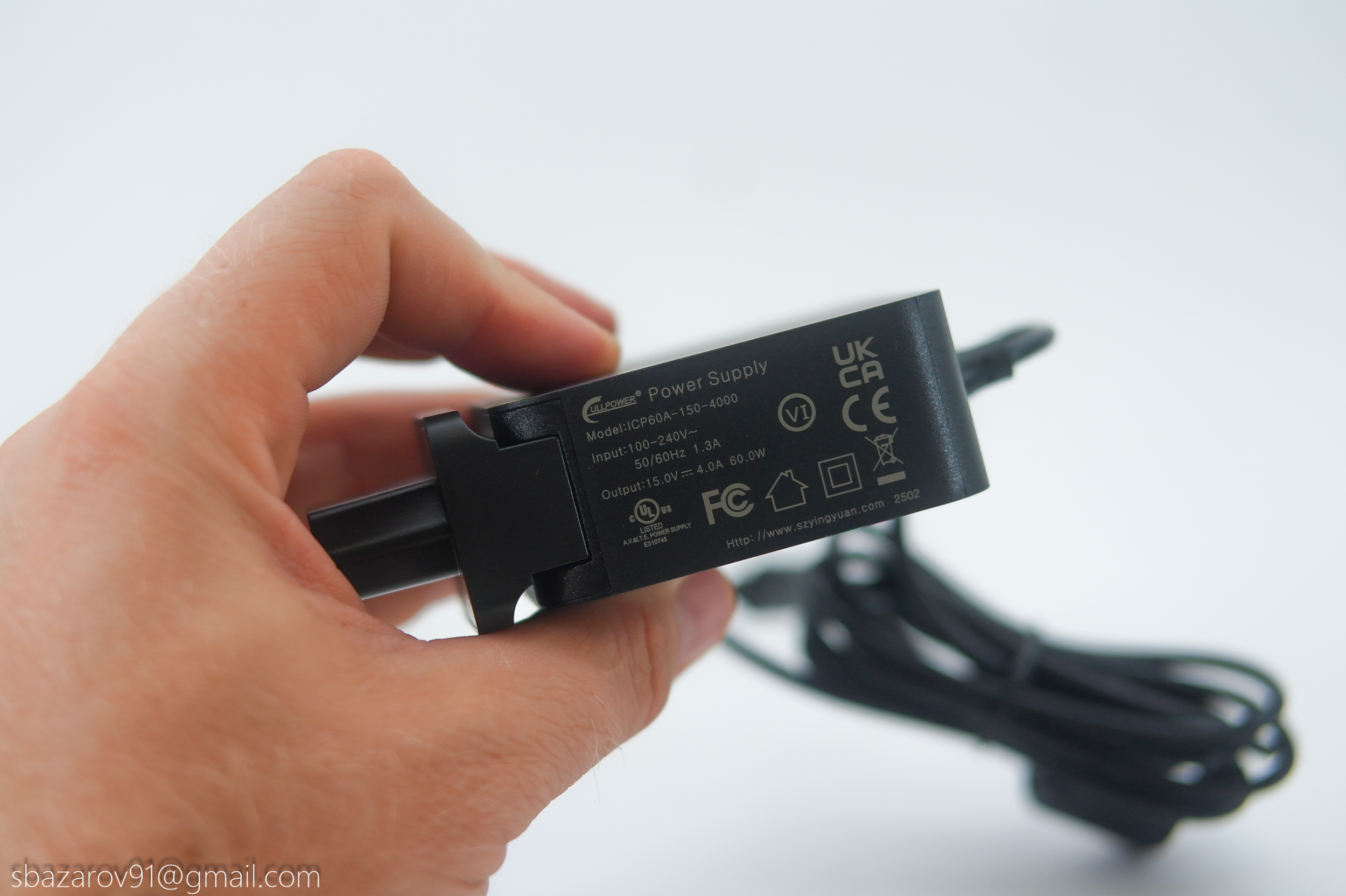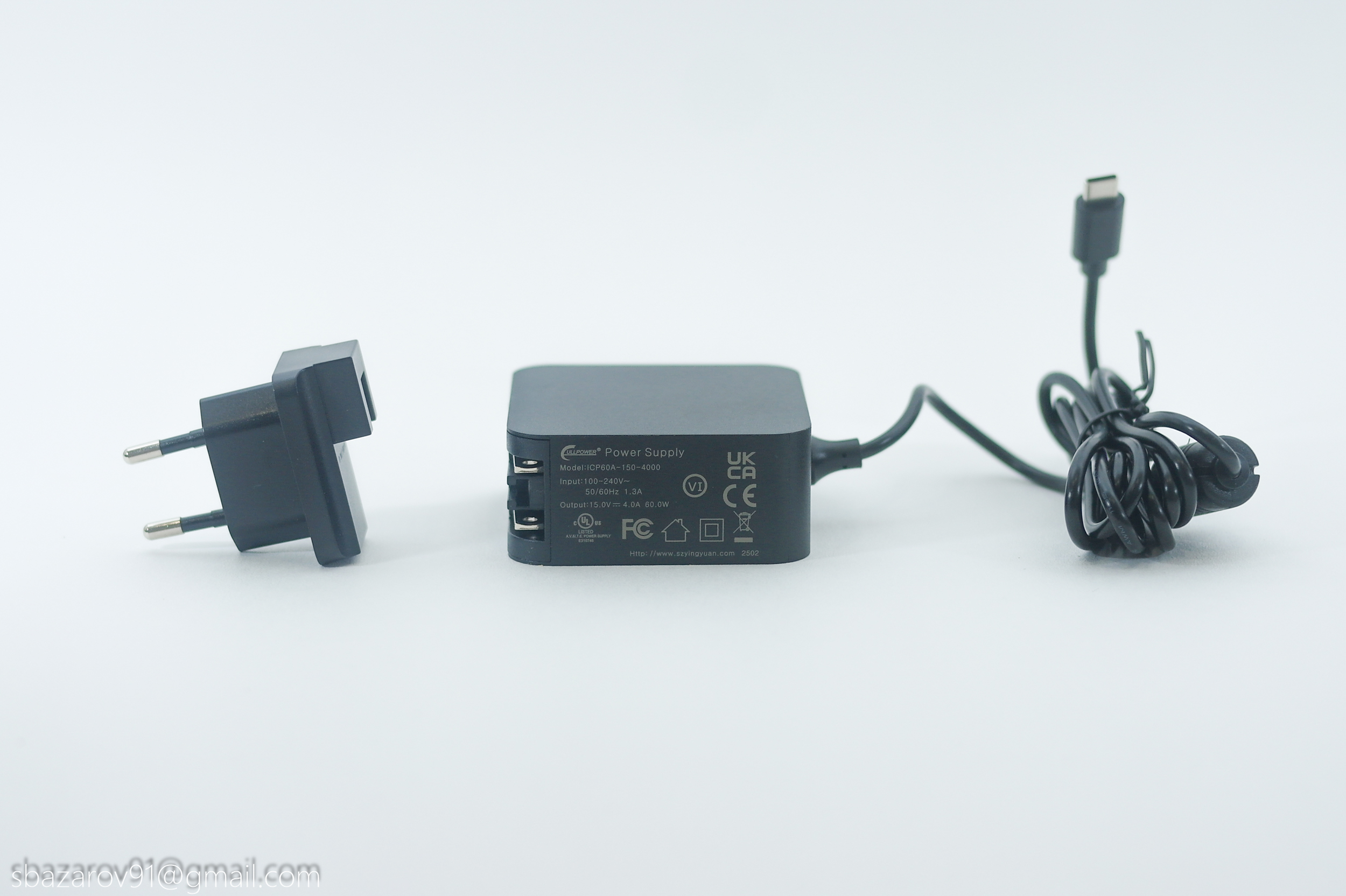 Вторым аксессуаром служит блок питания со съемной EU-вилкой. Он выдает 15 В/4 А (60 Вт) и заряжает встроенный аккумулятор за ~3 часа. Кстати, для зарядки используется Type-C-разъем, а значит, можно использовать в качестве источника питания любой Power Bank или стороннее ЗУ, главное, чтобы они умели выдавать нужные параметры (я пробовал оба способа — работает без нареканий).