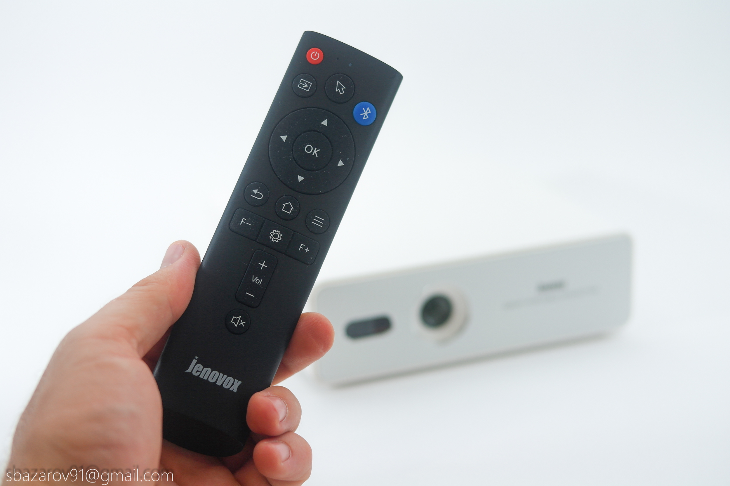 Для работы с Jenovox M5000 mini предусмотрен пульт дистанционного управления, который работает по BT-протоколу (при включении проектора происходит привязка пульта). По количеству кнопок M5000 mini — золотой стандарт. Тут есть ручная фокусировка, активация курсора, доступ к быстрым настройкам, кнопка MUTE и многое другое. Пульт работает от пары батареек типа ААА, которые уже идут в комплекте.
