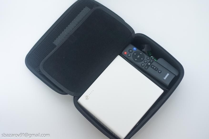 С Jenovox M5000 mini началось мое знакомство с базовым DLP-проектором, который в итоге стал отличным компаньоном во всех наших путешествиях. Мы брали его в горы, где в качестве экрана выступал купол шатра и простынь с кровати, брали в отпуск и смотрели фильмы на бежевой стене соседского дома. В основном Jenovox M5000 mini выручает за счет своих габаритов: в комплекте небольшая сумочка, вмещающая как сам проектор, так и новый блок питания, а также внешний накопитель с фильмами.