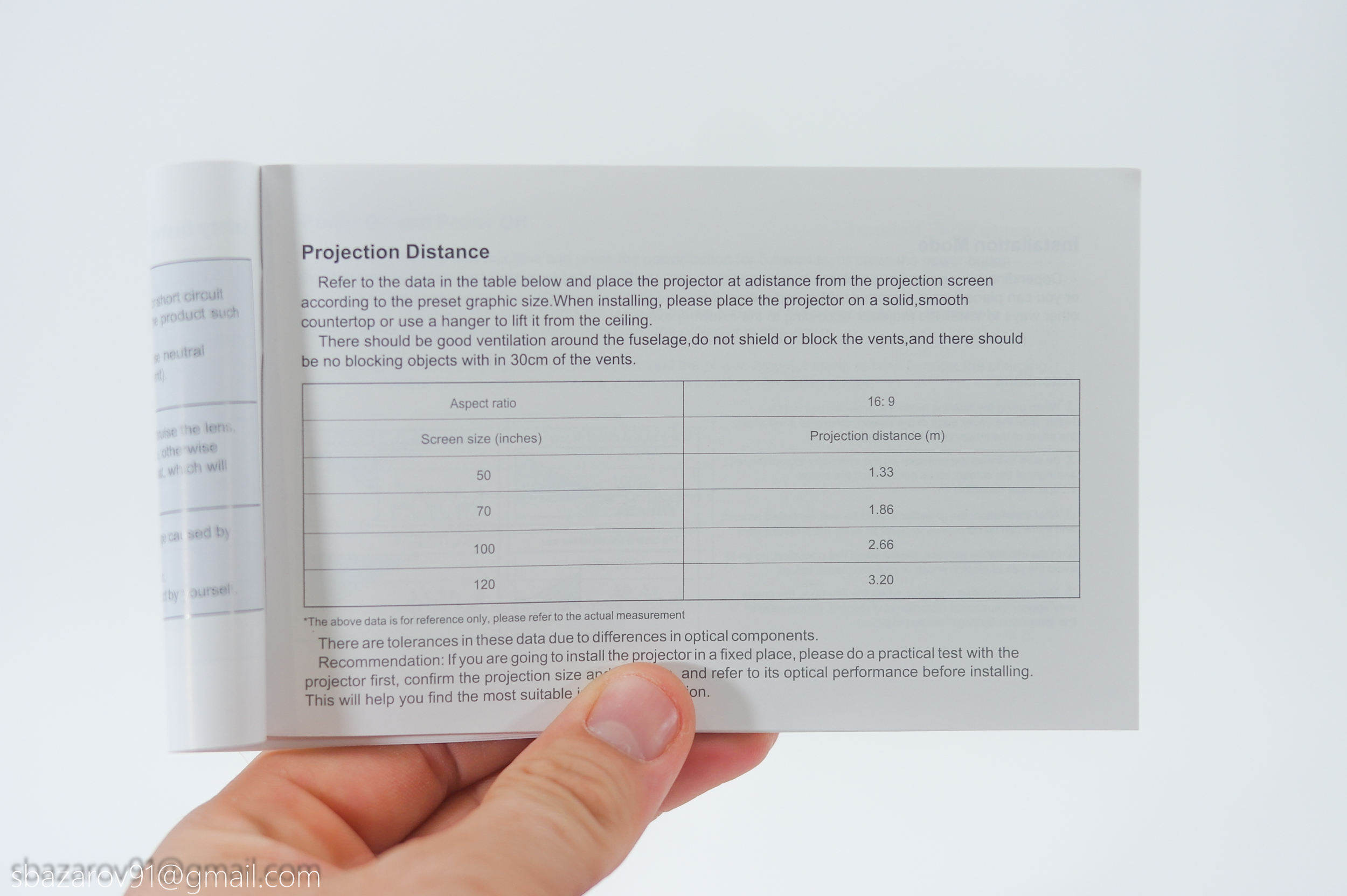 Для начала разберемся с размерами проекции. Максимальная проекция Jenovox M5000 mini составляет 120 дюймов с расстояния 3.2 метра. Если нужно меньше (как в моем случае — 100″), то это уже 2.66 метра. В целом проекционное соотношение сильно меньше, чем у моего 1LCD-проектора Voxflix M25, проецирующего 220″ изображение с 4 метров. Ну, а так как я использую 100″ полотно, то мне достаточно. Кстати, соотношение сторон у M5000 mini — 16:9, вместо привычных 4:3.