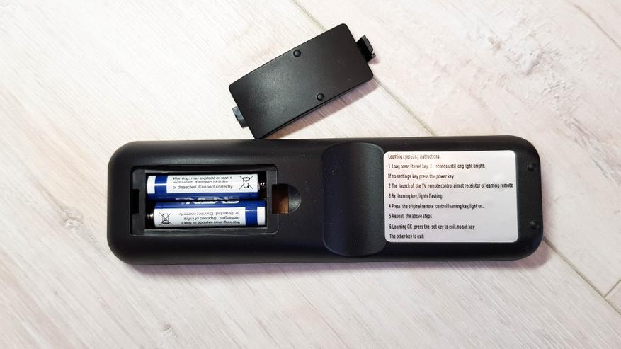 На обратной стороне есть инструкция, объясняющая как запрограммировать кнопки. Здесь все, как обычно: заходим в режим программирование (длительно нажимаем зеленую кнопку), потом зажимаем на несколько секунд кнопку, которую хотим обучить (начнет мигать индикатор) и направив пульт на пульт нажимаем кнопку, которую хотим клонировать. Повторяем процесс до победного конца. Для питания пульта нужно 2 AAA батарейки, в комплекте не идут.