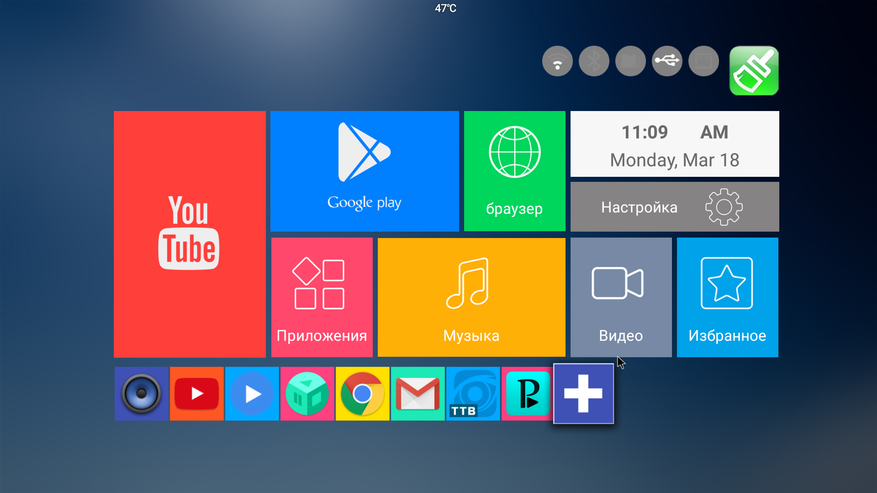 Стартовый экран лаунчера состоит из плиток разных размеров. Основная часть жестко прописана в системе и запускает заданные приложения: Youtube, Google Play, браузер и т.д. Отдельная плитка показывает текущее время и дату. Есть кнопка для быстрой очистки оперативной памяти. В виде значков показывается статус беспроводных подключений и различных накопителей.
