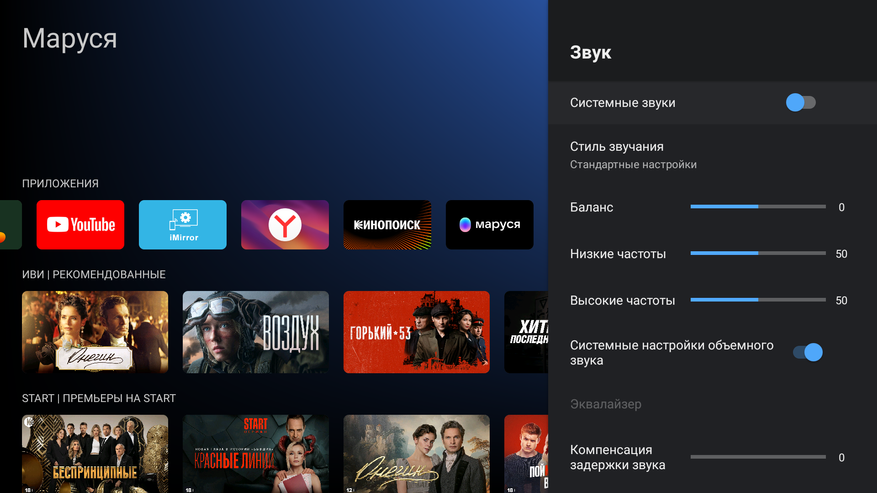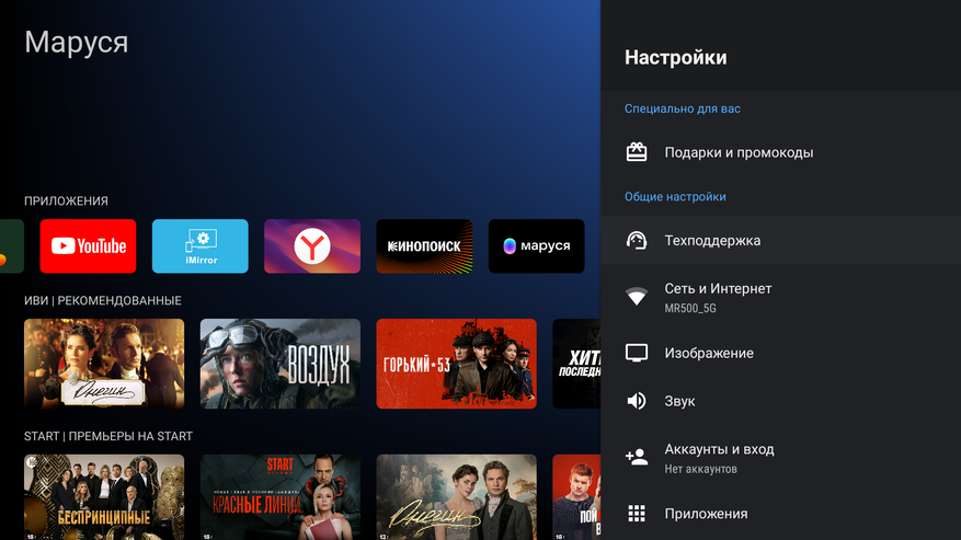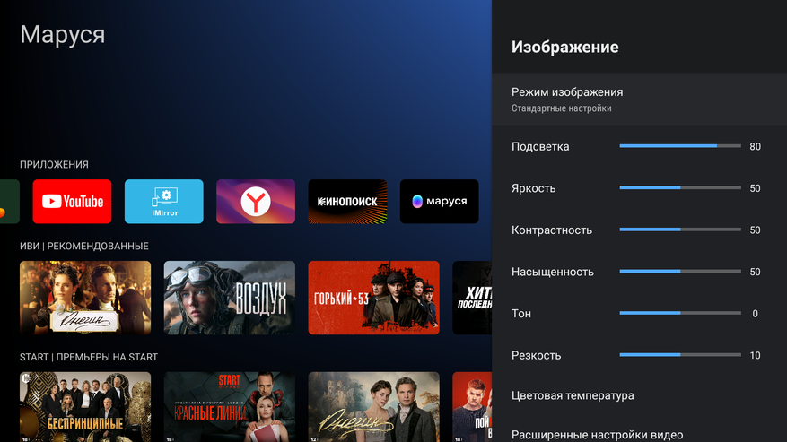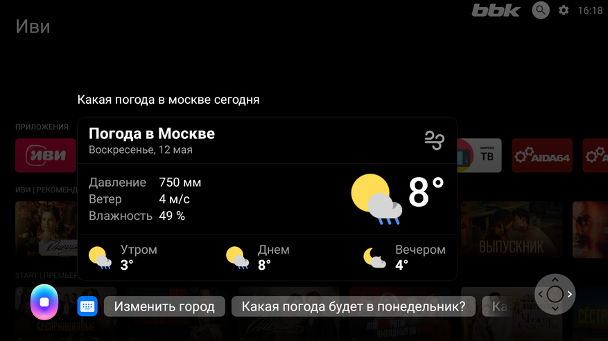 Кстати о досуге, есть тут голосовой помощник Маруся. С его помощью можно не только выбирать, что посмотреть, но и узнавать погоду, управлять умным домом и так далее, просто говоря это в пульт. Пульт, к слову, поставляется в комплекте и является своеобразным мостом между вами и телевизором.