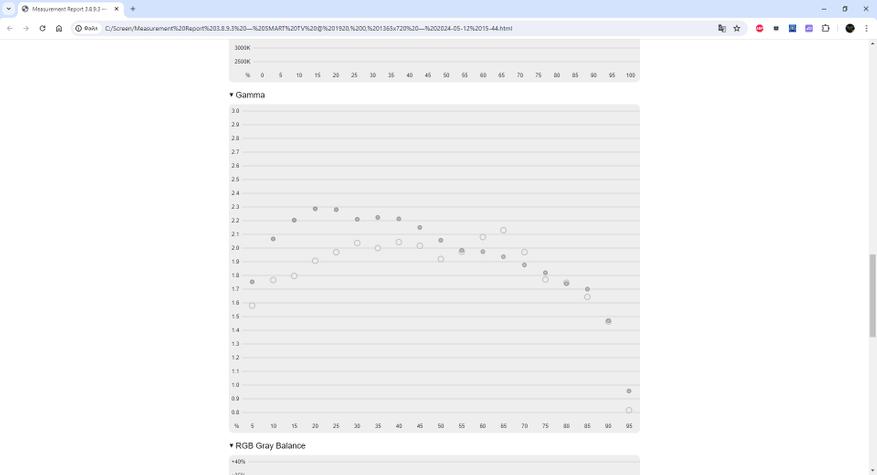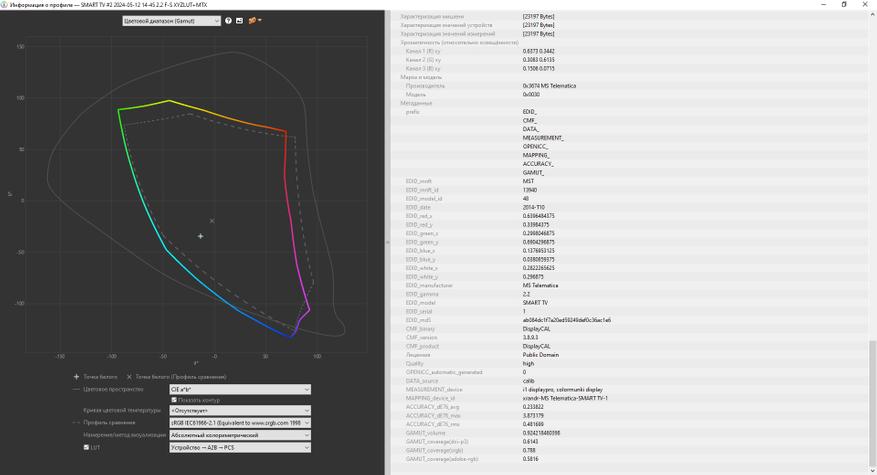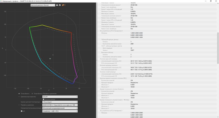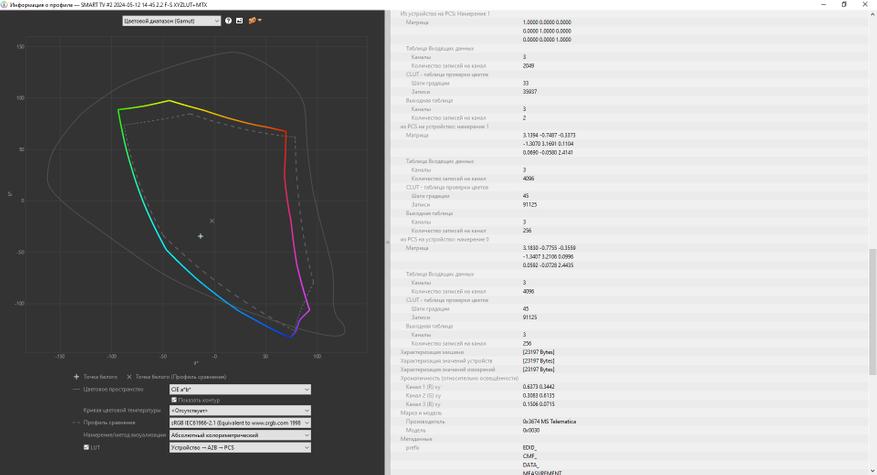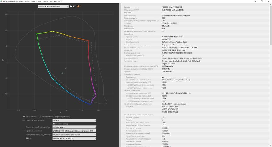 Теперь давайте рассмотрим результаты, полученные при калибровке экрана телевизора, чтобы оценить его характеристики. Прежде всего давайте обратим внимание на охват цветового пространства. Из данных видно, что телевизор покрывает 92.4% цветового пространства sRGB, 63.7% Adobe RGB и 65.5% DCI P3. Эти параметры говорят о том, что телевизор хорошо воспроизводит широкий спектр цветов в стандарте sRGB, который является основным в интернет-контенте и телевизионном вещании. Однако охват Adobe RGB и DCI P3 меньше, что может сказаться на воспроизведении более насыщенных цветов, что важно для профессиональных фотографов.