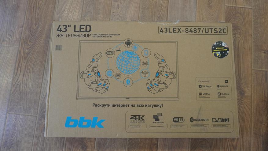 Телевизор BBK 43LEX-8487/UTS2C поставляется в коробке из переработанного картона, которая содержит на себе основные сведения об устройстве и его основных особенностях.