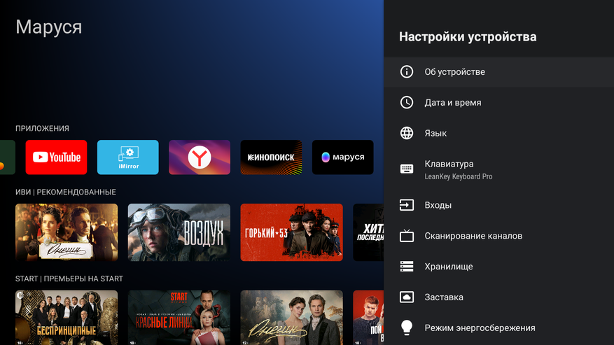 Телевизор имеет 1.5 ГБ оперативной памяти и 3.72 ГБ (доступной для пользователя) внутренней памяти, расширяемой за счет внешних накопителей, что вполне достаточно для хранения приложений и системных файлов. Как уже я упоминал ранее, устройство работает на операционной системе Android 11, предоставляя доступ к множеству приложений.