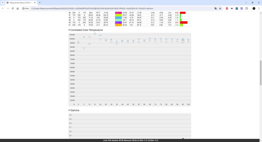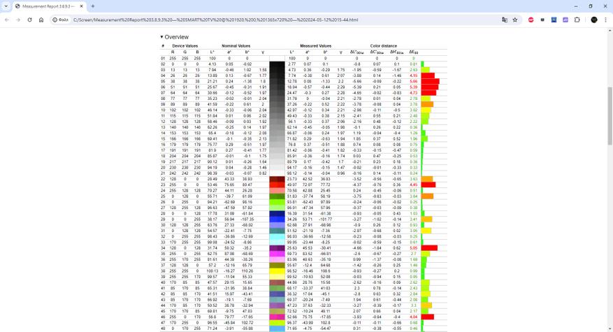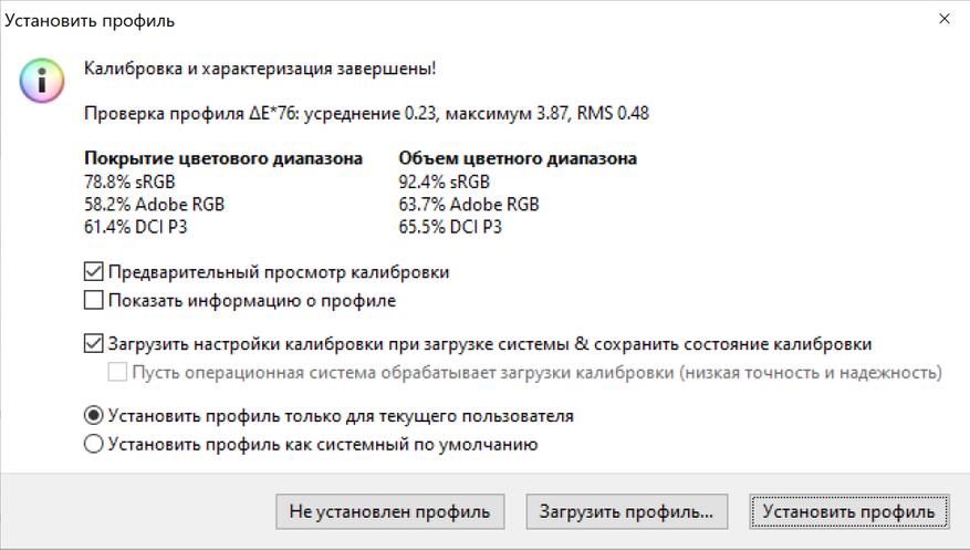 Калибровка экрана показала, что среднее отклонение по цвету (∆E) составляет 0.48, что является хорошим показателем, указывающим на точность цветопередачи. Максимальное отклонение достигает 3.87, что может быть заметно в определенных условиях, особенно при просмотре контента с большим количеством оттенков одного цвета.