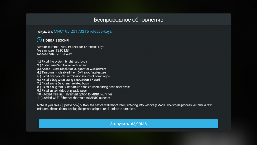 Система обновляется «по воздуху» через программу «Беспроводное обновление MINIX».