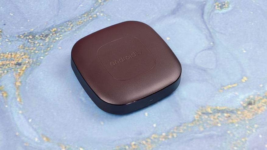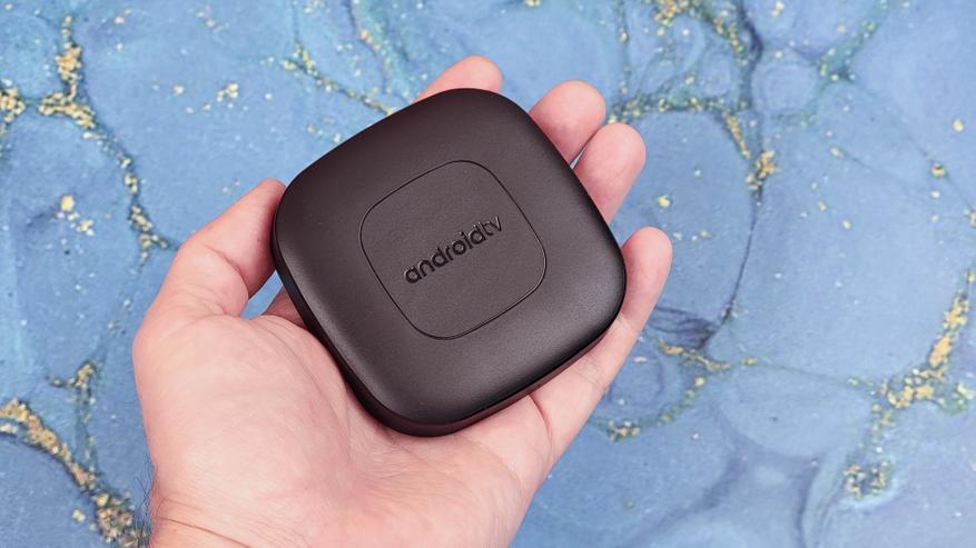 Посмотрим на приставку. Ее корпус целиком пластиковый, на верхней части выгравирована надпись AndroidTV. Типичный ноунейм.