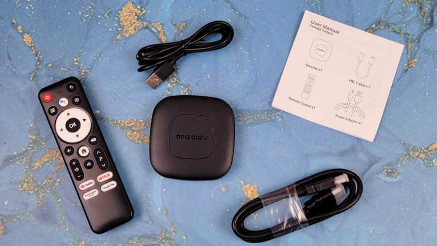 Приехала приставка в коробке, имитирующей более дороге решения. Судя по информации с упаковки, нам обещают Android 14, быстрый WiFi, бриллиантовую 8К картинку и поддержку различных популярных сервисов, в том числе Netflix. И все это, напомню, за 17 баксов. Ну посмотрим…
