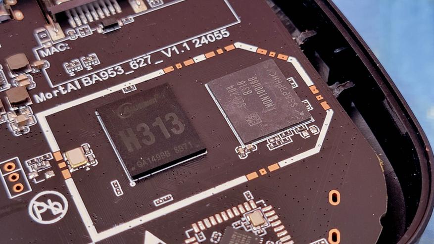 Здесь видим процессор Allwinner H313 и флеш память от Samsung KMQN10006B-B318. И вот тут начинается интересное, ведь по даташиту эта память проходит как 8GB. Причем судя по всему часть памяти здесь еще выделяется под оперативку, так отдельного чипа оперативки на материнке нет. Это же подтверждают и некоторые утилиты, которые мне удалось завести на этой коробке. Получается, что нас обманывают? Или просто перепутали? Но на коробке указано 2GB\16GB, а по факту я получил 2GB\8GB. Это повод открыть спор и вернуть деньги. Тем более, как я покажу позже, это здесь не единственный обман.