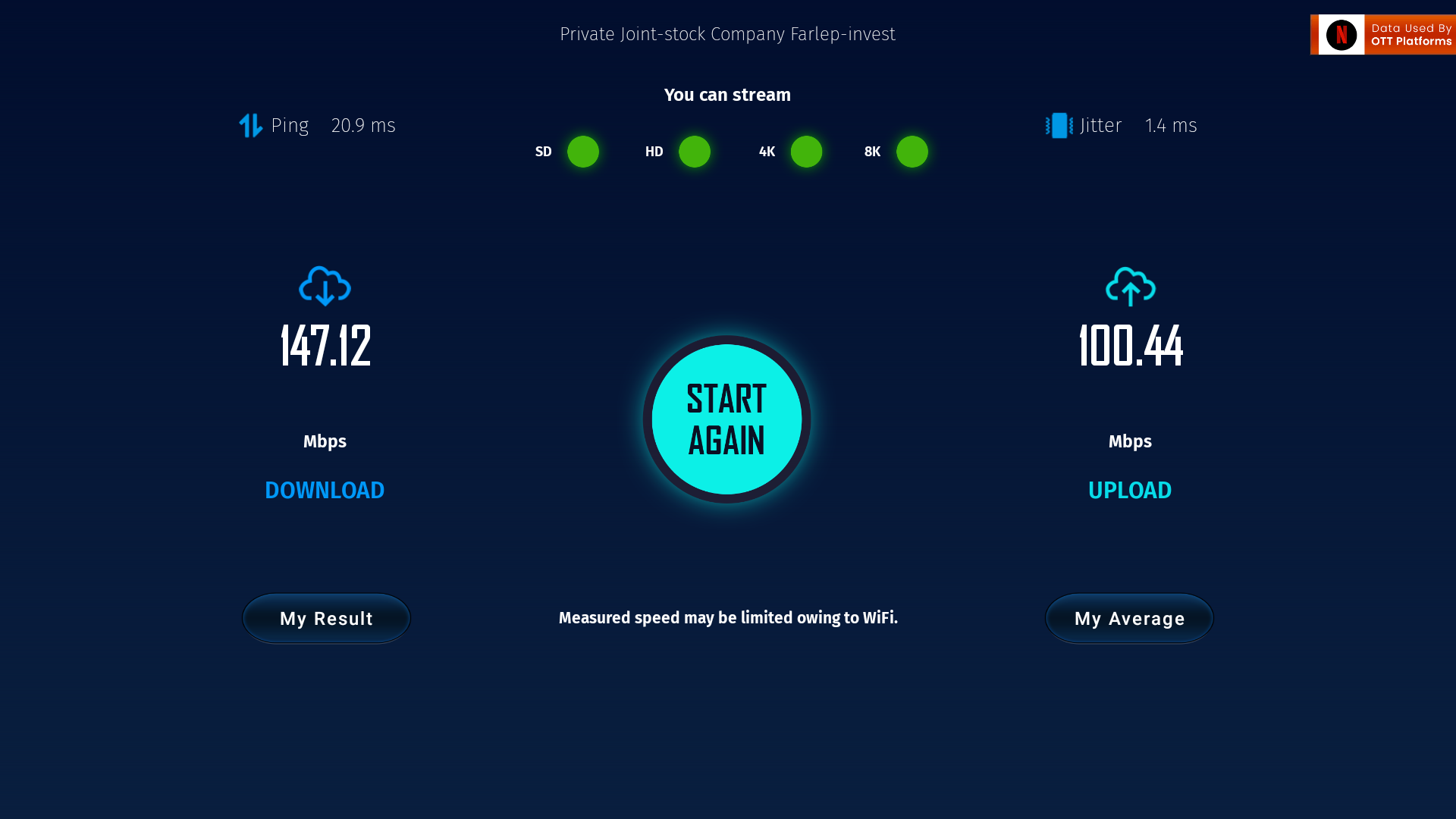 Если роутер находится в одной комнате с приставкой, то ситуация значительно улучшается. 147 Mbps на скачивание и 100 Mbps на отдачу. В этом случае уже можно смотреть любой контент, в том числе 4К. Получается, что приставкой можно пользоваться, только если роутер расположен в непосредственной близости. А возможности подключения интернета через кабель нет, т. к LAN порт отсутствует физически.