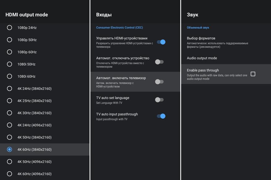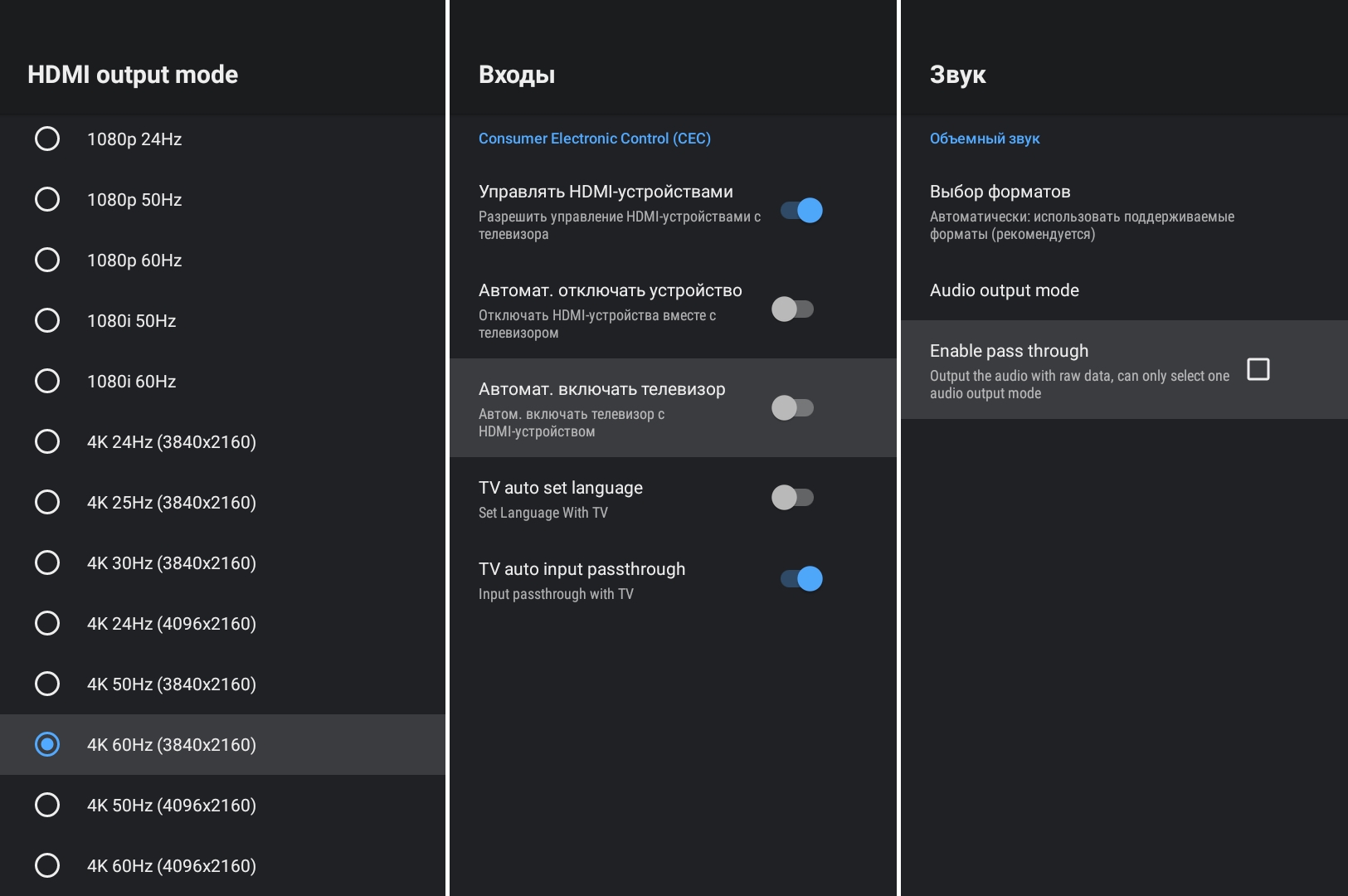 Поддерживается вывод изображения в 4К с частотами 60\50\30\25\24 Hz. Автофреймрейта конечно нет. Заявленные «бриллиантовые 8К» это маркетинговый булщит. На самом деле 8К приставка может открыть только в виде изображения. Не говоря уже о том, что даже вывести это 8К изображение на телевизор она не сможет, т. к ограничена 4К по HDMI. Есть ли хорошие новости? Совсем чуть-чуть. Например, работает HDMI-CEC для управления приставкой и TV одним пультом. По звуку имеем только базу, никакого многоканального звука нет. По крайней мере Dolby на моем телевизоре не завелся.