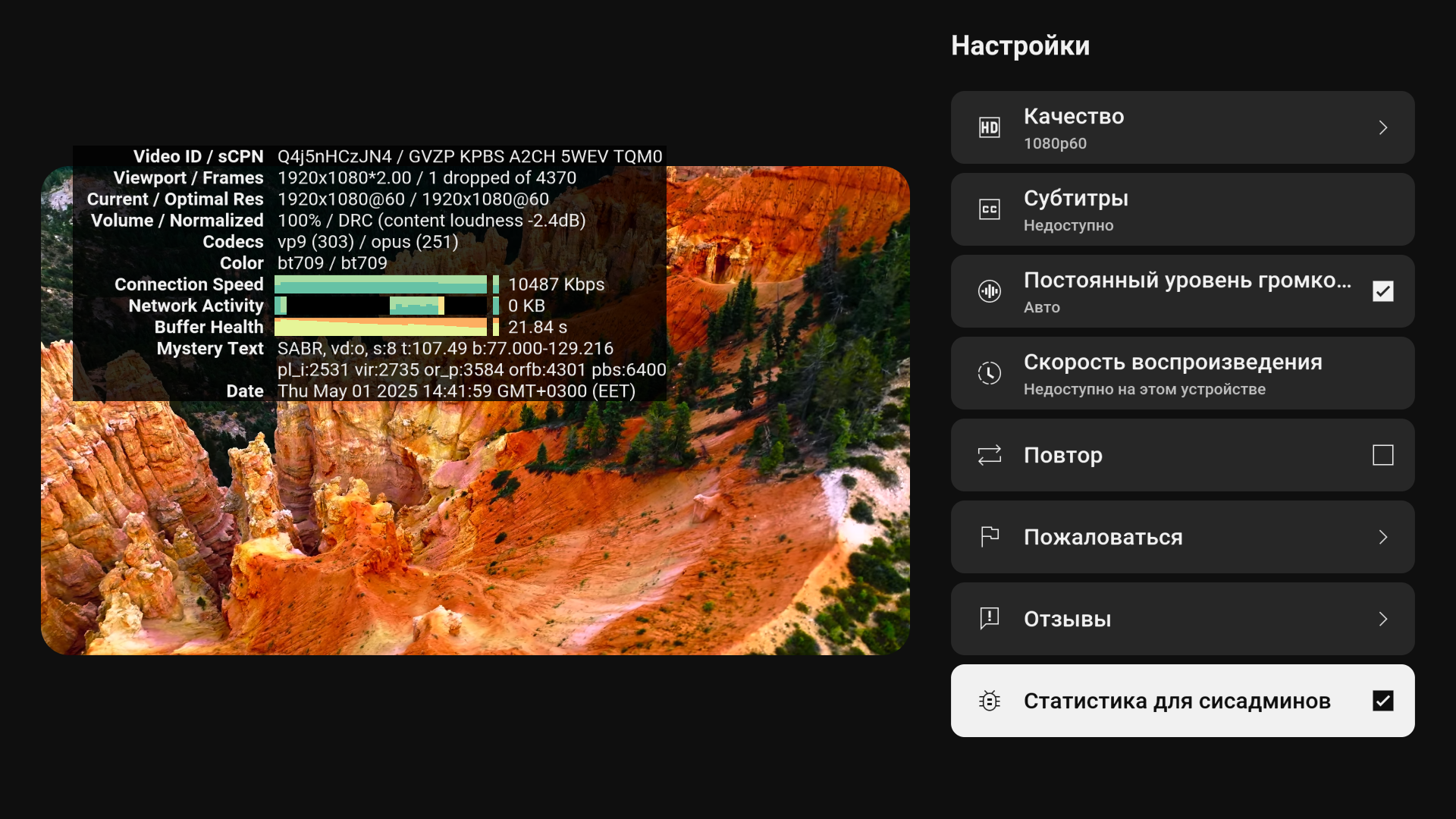 При воспроизведении Youtube приставка вытягивает только Full HD. Максимальное качество, которое она может воспроизвести это 1080p60. Если включить 1440p или 2160p видео виснет. Также в Youtube нет поддержки HDR, даже если включить принудительный HDR в настройке приставки.