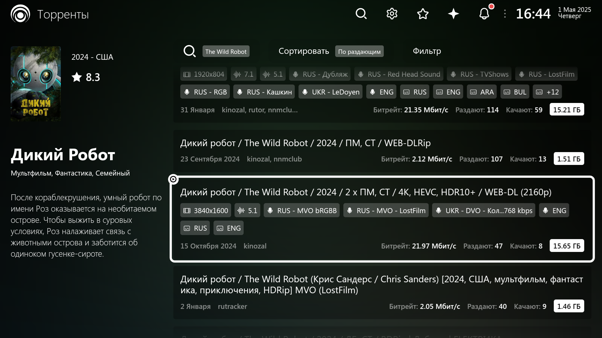 При воспроизведении с торрентов при помощи TorrServe приставка тянет не очень тяжелые торренты, весом до 20 GB. Поддержки HDR также нет, воспроизводится фильм как обычный SDR.