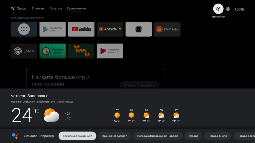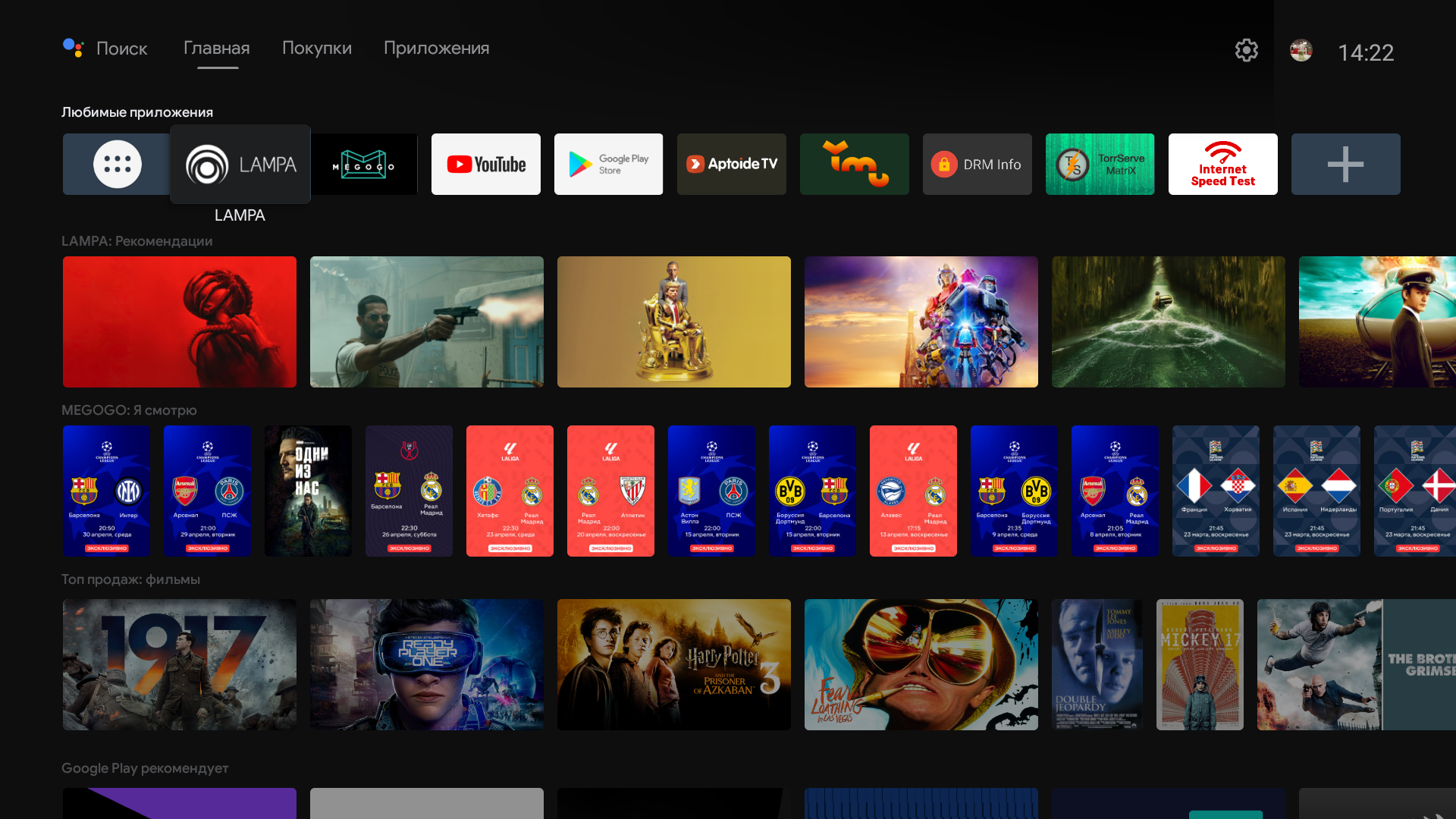 Приставка работает на Android TV и это хорошо, т. к можно настроить порядок приложений и рекомендательных каналов. Но если вы немного разбираетесь в вопросе, то сразу поймете, что это точно не Android TV 14. Такие интерфейсы я видел много лет назад, на самых первых версиях ATV. Маленькие ярлыки над рекомендациями, отдельная кнопка и страничка для установленных приложений. В меню отображаются даже не адаптированные под ATV приложения.