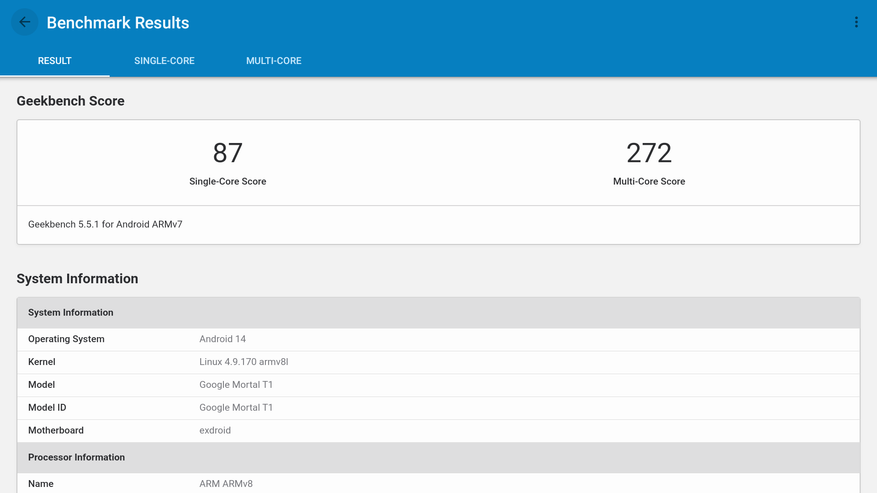 Собственно тестировать производительность столь слабого устройства особого смысла нет, но все же хотелось бы узнать на каком уровне находится процессор. Опять же, Antutu и Geekbench 6 просто не захотели устанавливаться на приставку, но я нашел в выход в виде установки более старой версии бенчмарка Geekbench 5. В одноядерном тесте приставка набрала всего 87 очков, в многоядерном 272 очка. Сравнивать естественно нужно с аналогичной версией бенчмарка, т. к в новой версии система подсчета очков отличается.