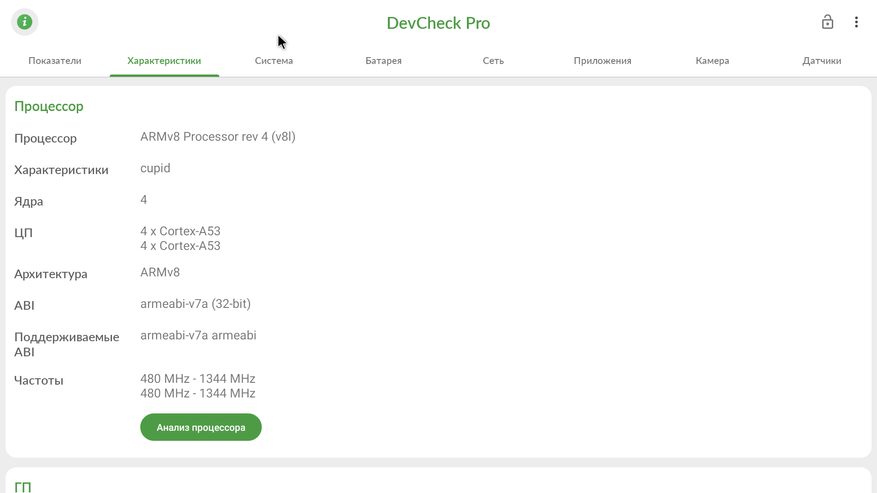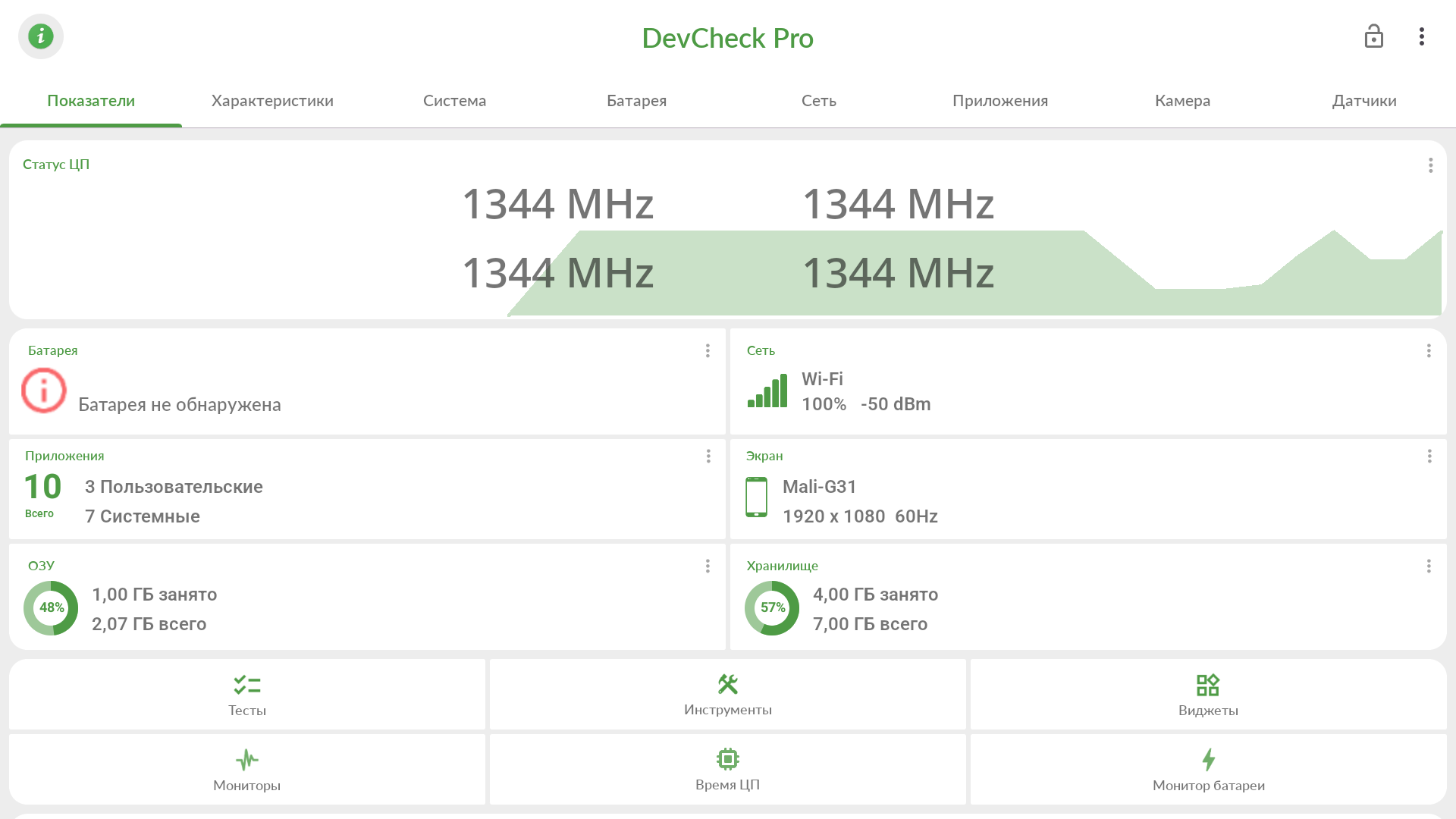 Однако мне нашлось найти утилиту, которая установилась на приставку и при этом даже показала реальные характеристики. Это DevCheck в версии Pro, которую я приобрел еще пару лет назад. На главной странице сразу видим основные характеристики, в том числе и по памяти. Как видим хранилище всего 7GB, из которых свободно только 3GB.