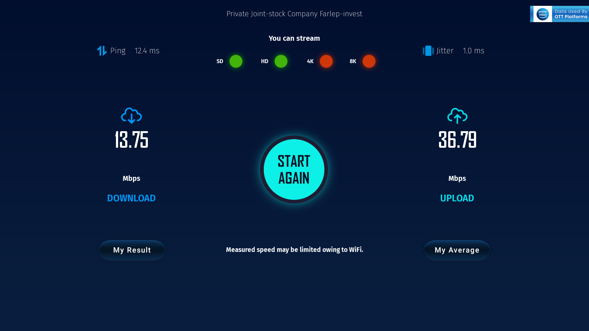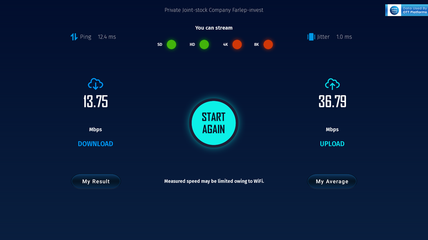 Следующим делом проверил скорость WiFi и уровень приема сигнала. И здесь очередной провал. В диапазоне 5 GHz приставка работает отвратительно. Непонятные задержки в несколько секунд, периодически полный отвал сети и как следствие, использовать приставку в диапазоне 5 GHz не возможно. В диапазоне 2,4 GHz тоже не все хорошо. Фактически, если роутер находится не в одной комнате с приставкой, скорость сильно падает. У меня через 2 стены от роутера приставка показала всего 14 Mbps на скачивание и 36 Mbps на запись. Этого даже недостаточно для просмотра онлайн в хорошем качестве.