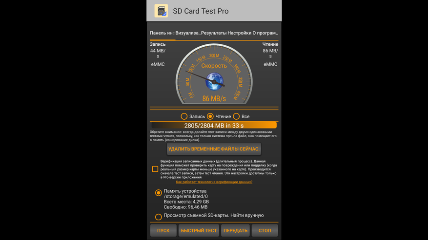 Проверил скорость накопителя. Здесь все более — менее пристойно: 44 MB/s на запись и 86 MB/s на чтение.